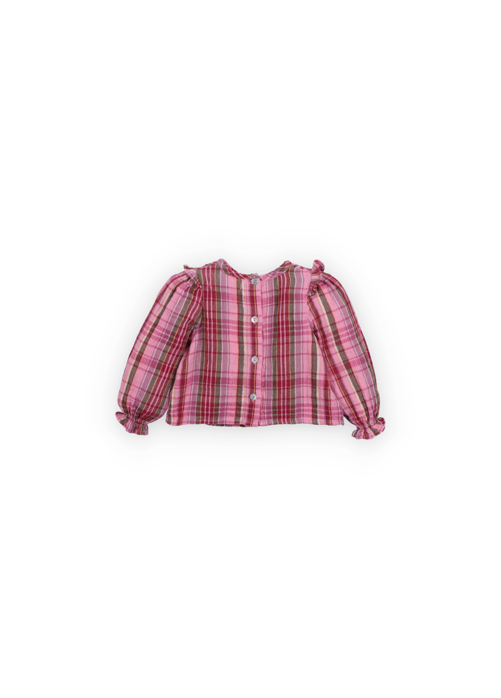 One of the classic double gauze blouse patterns, featuring contrasting embroidery detail at the front. It has a back opening with buttons and comes with matching pants to create a complete look.