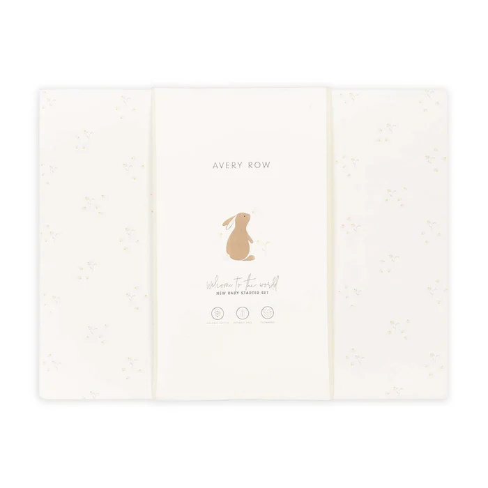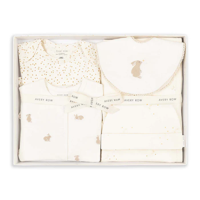Featuring sweet little bunnies and a delicate prints. Made from the softest 100% organic cotton to be gentle on your babies skin. The perfect addition to babies wardrobe, this set is tied up in a bow and packaged in a box, making this the perfect gift.