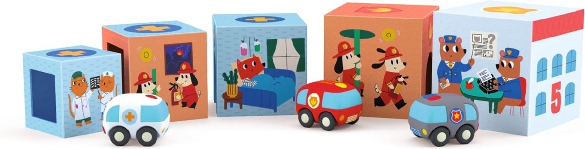 • 5 illustrated blocks housing 3 vehicles to play with and build a lovely town.