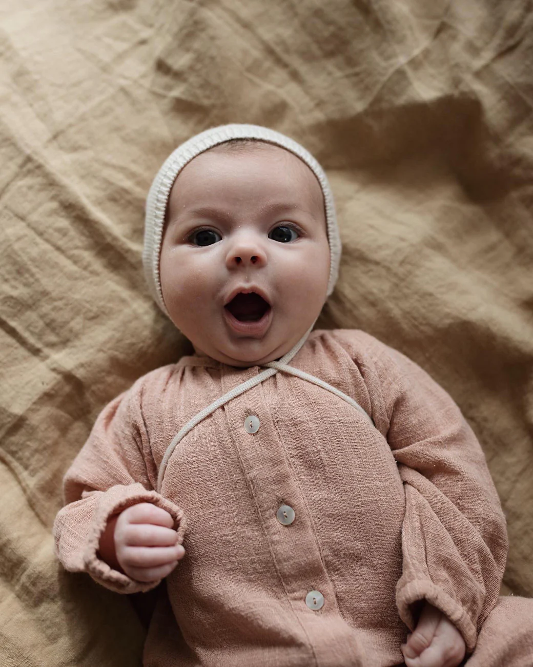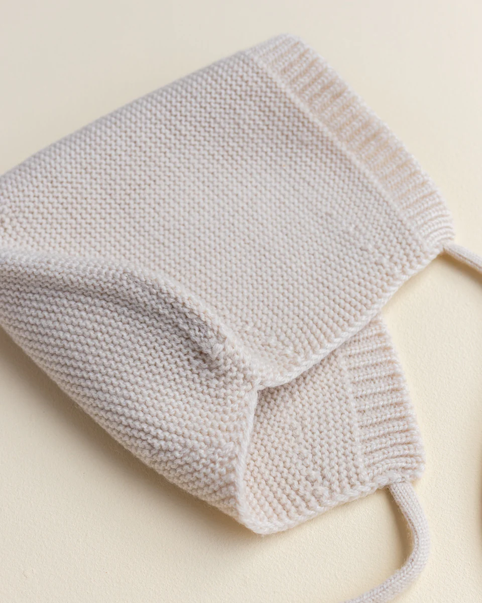 • A soft seamless knitted bonnet made in 100% merinowool. The bonnet is mediumthick and perfect to wear outside and inside as well. It keeps the babies on a good temperature. The ribbon makes it a good fit on the head.