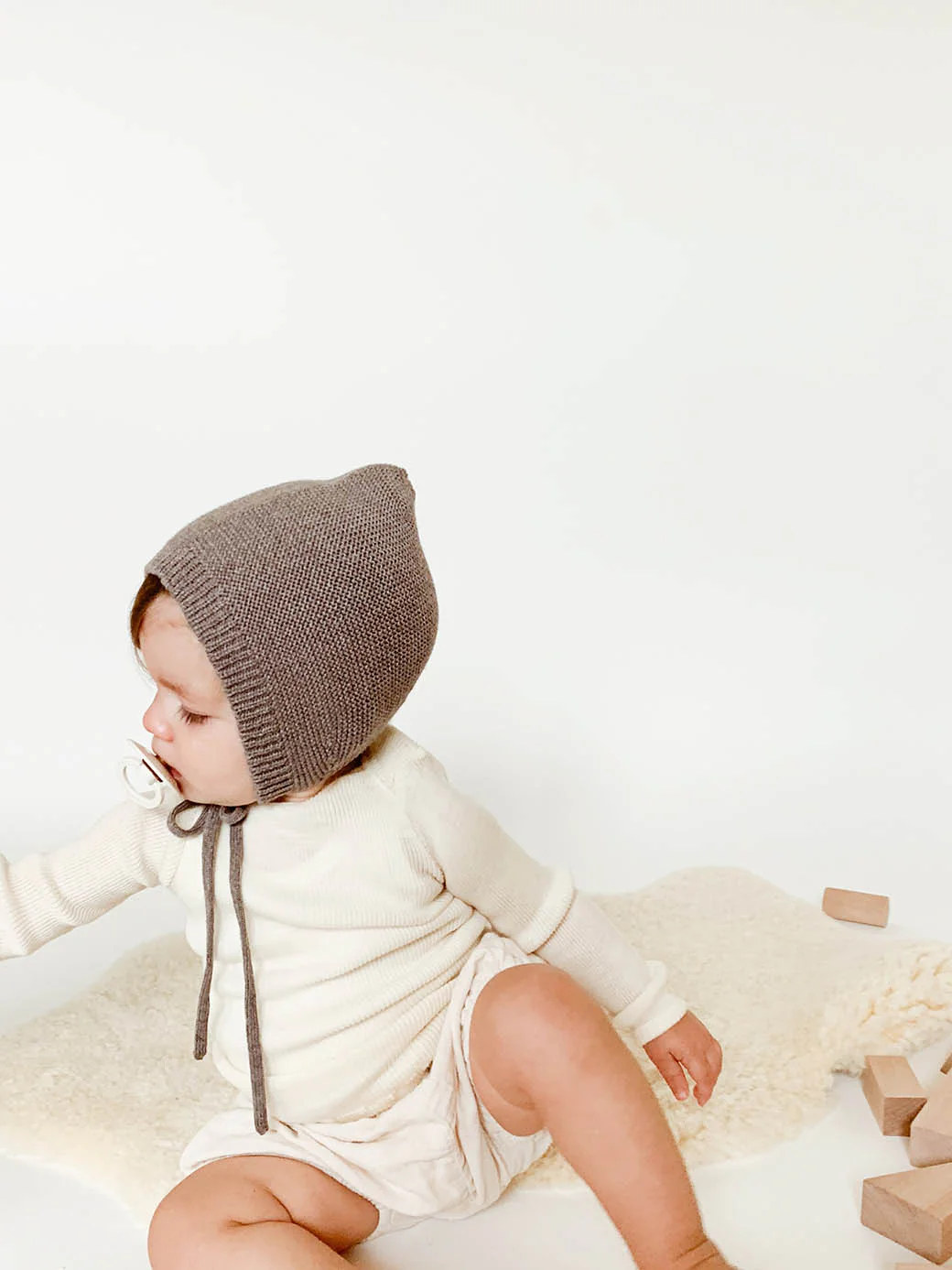 • A soft seamless knitted bonnet made in 100% merinowool. The bonnet is mediumthick and perfect to wear outside and inside as well. It keeps the babies on a good temperature. The ribbon makes it a good fit on the head.