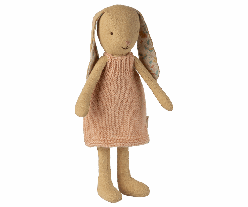A classic rabbit made of soft natural fabrics that gives a lovely hand feel and look. Size 1 rabbit fits into the House of miniature and all furniture size mini and miniature. Fabric may vary.
