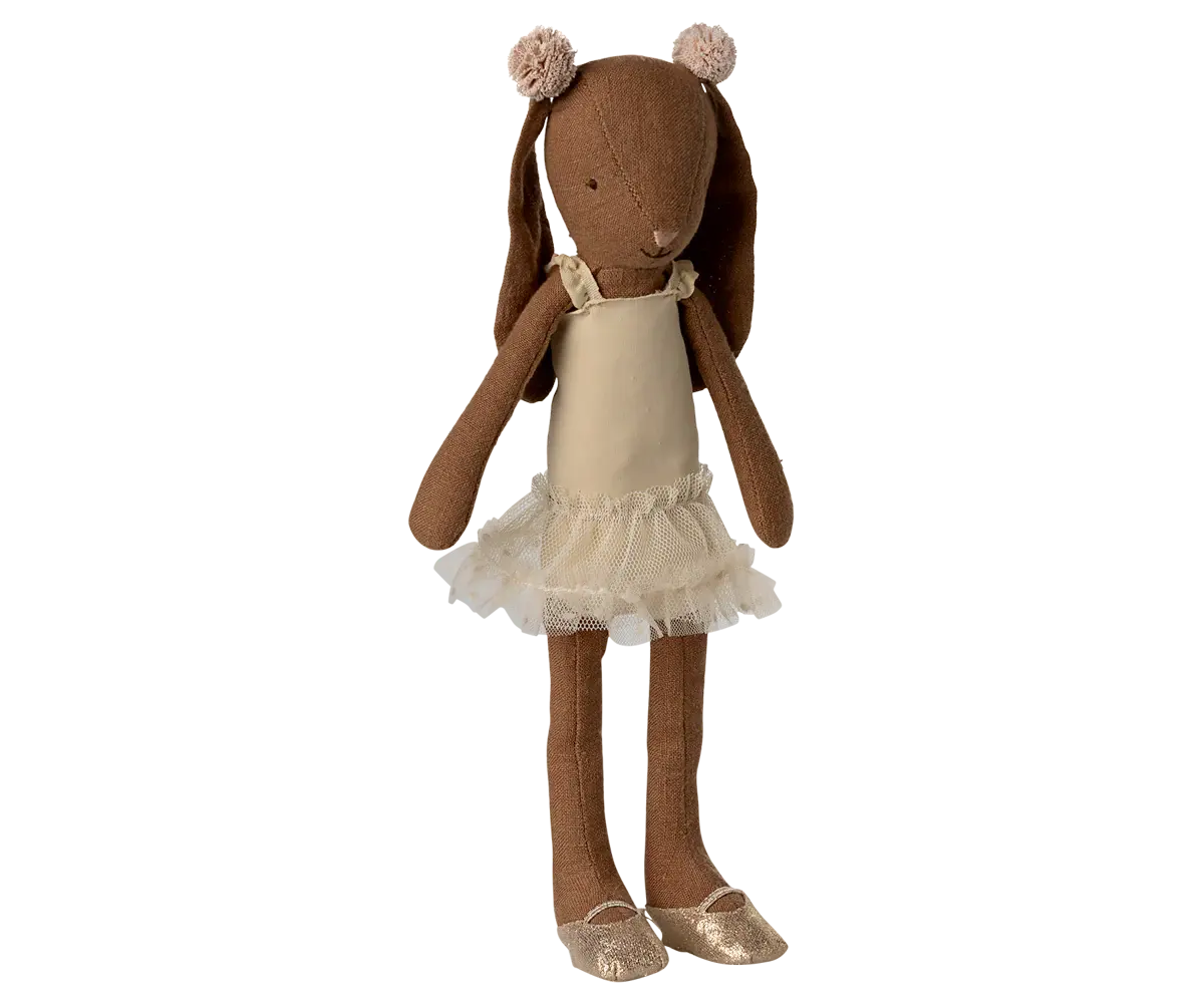 The Bunny Size 2, Chocolate Brown – Ballet Suit and Skirt Cream is a beautifully handmade Maileg bunny with a warm chocolate tone and an elegant cream ballet outfit.Her removable ballet suit and delicate tulle skirt inspire gentle, imaginative play and endless storytelling.