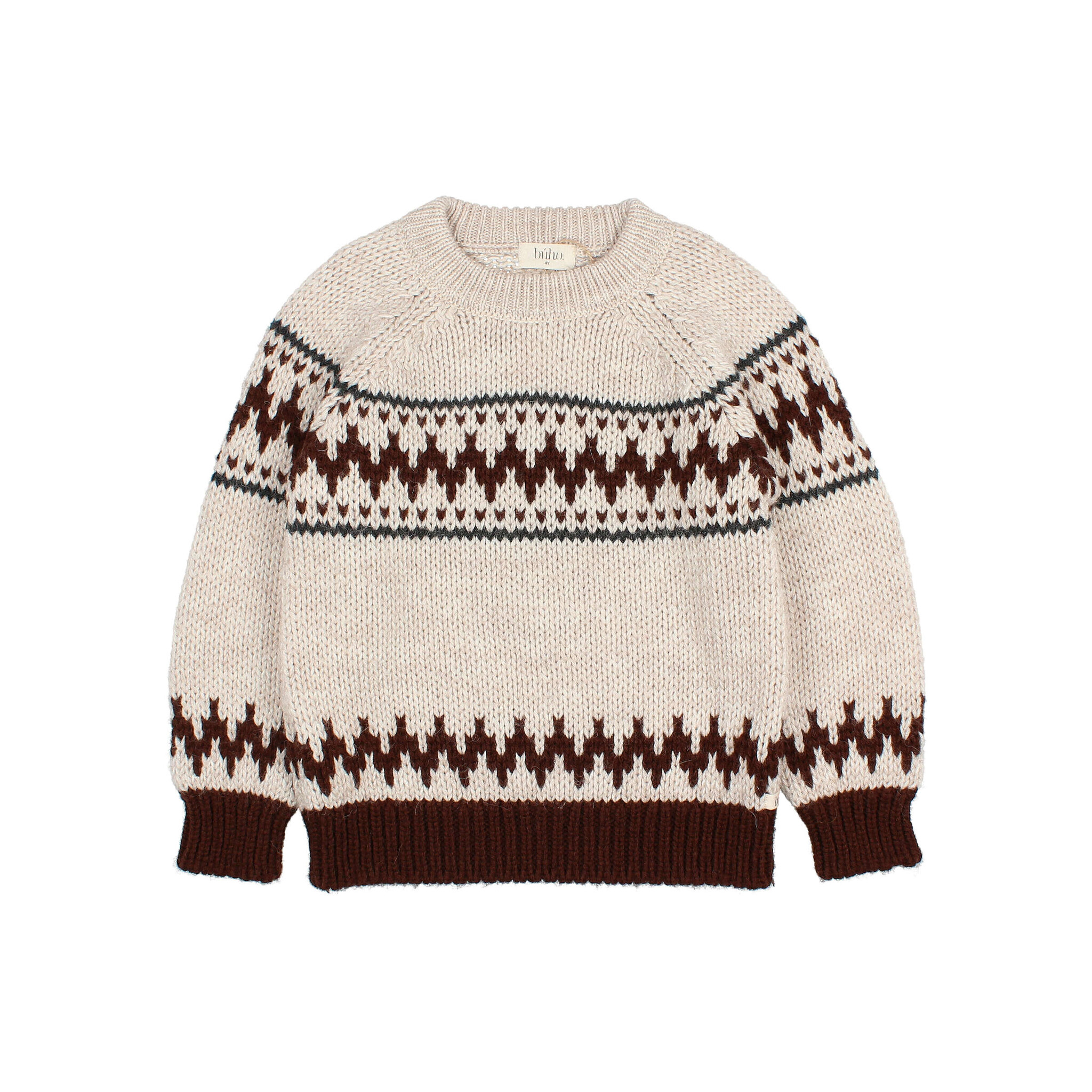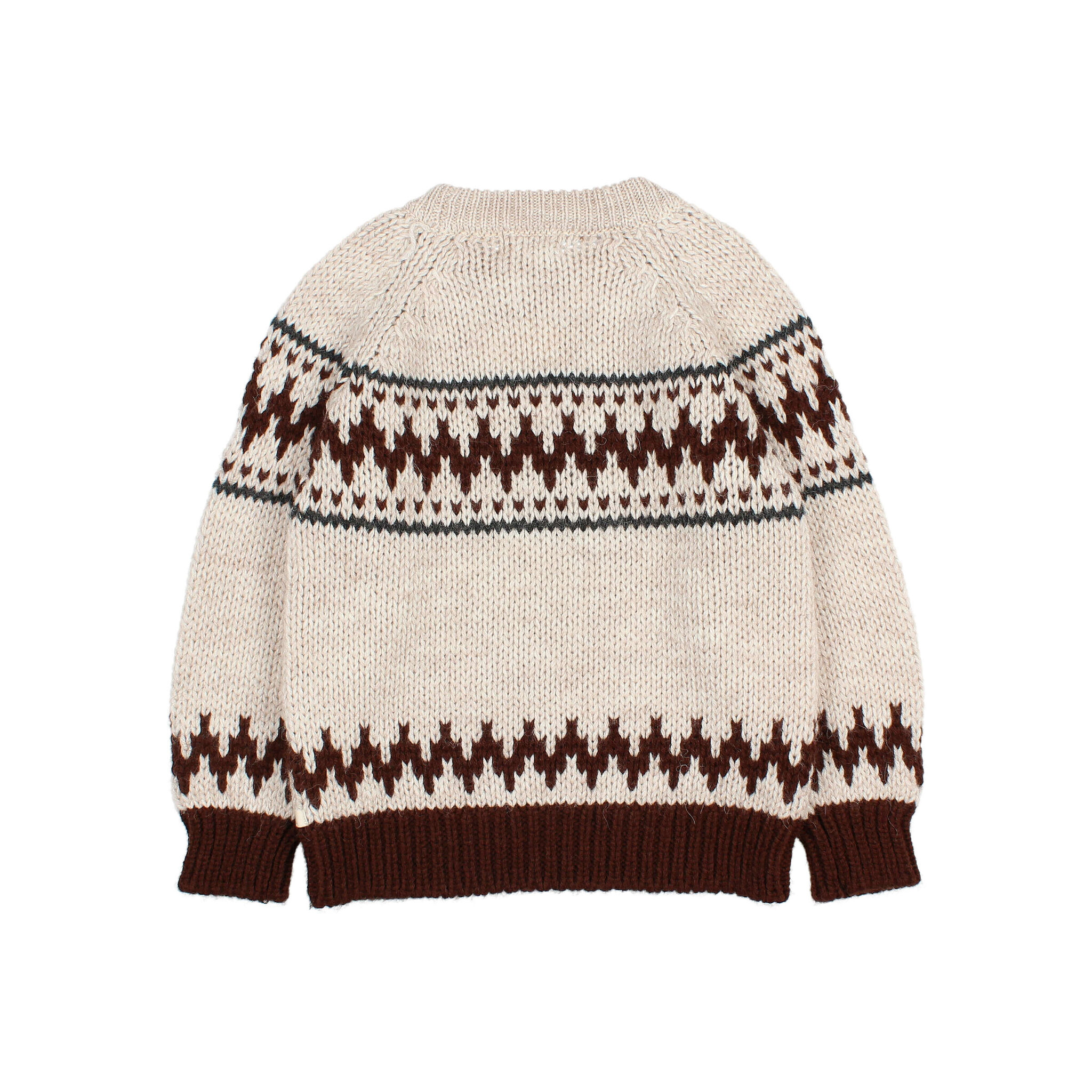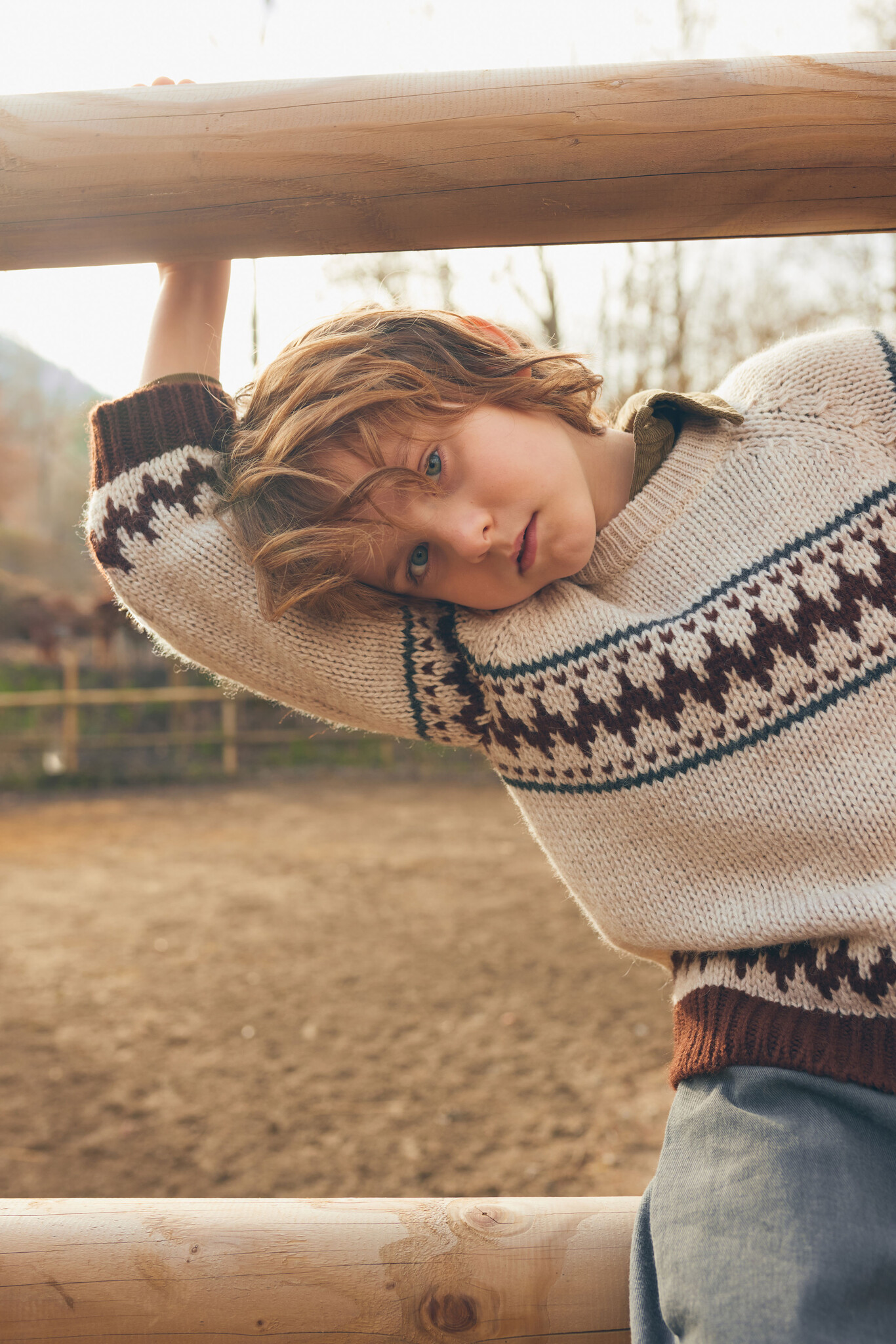• Knitted jumper with folk motif. Round neck. Raglan sleeves. Ribbed finishes.