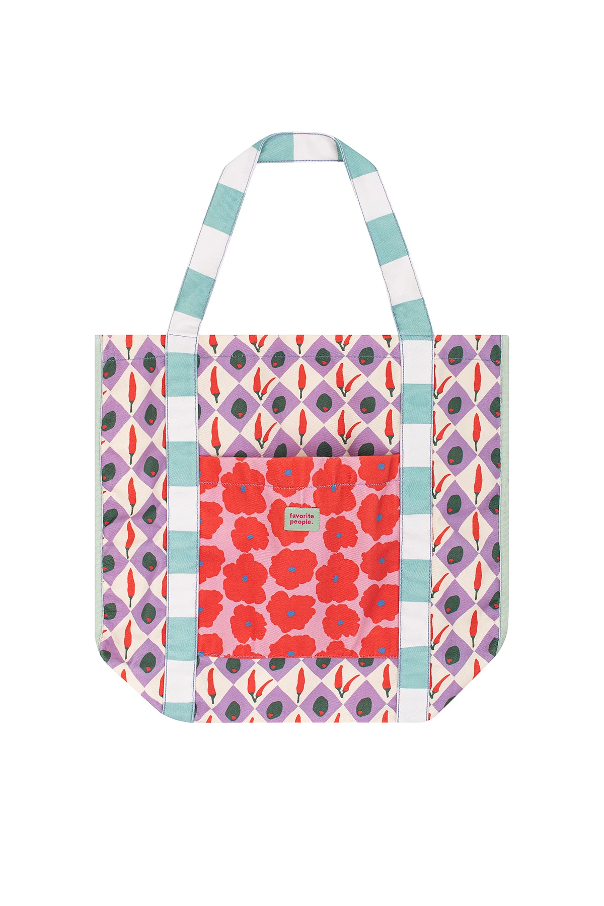 • A carry-it-all tote in white and lilac squares with olives and chillies, perfect for beach days, markets, or everyday outings. Durable yet lightweight.