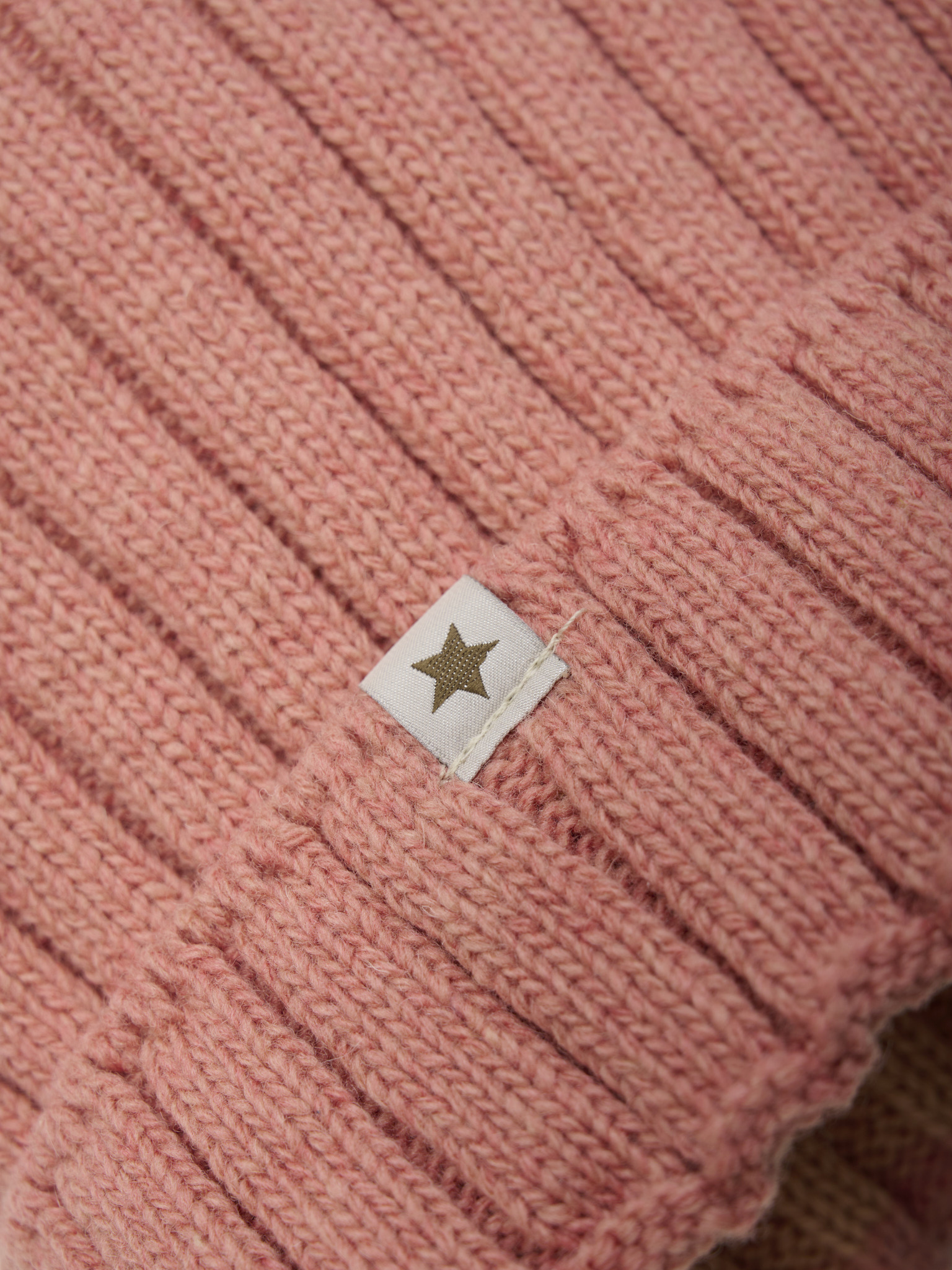 Lovely knitted HUTTEliHUT balaclava with two soft alpaca pom-poms on top of the head. The hat is in a thick knit for cold winter days. Inside the ribbed fold, is knitted with a soft cotton yarn.