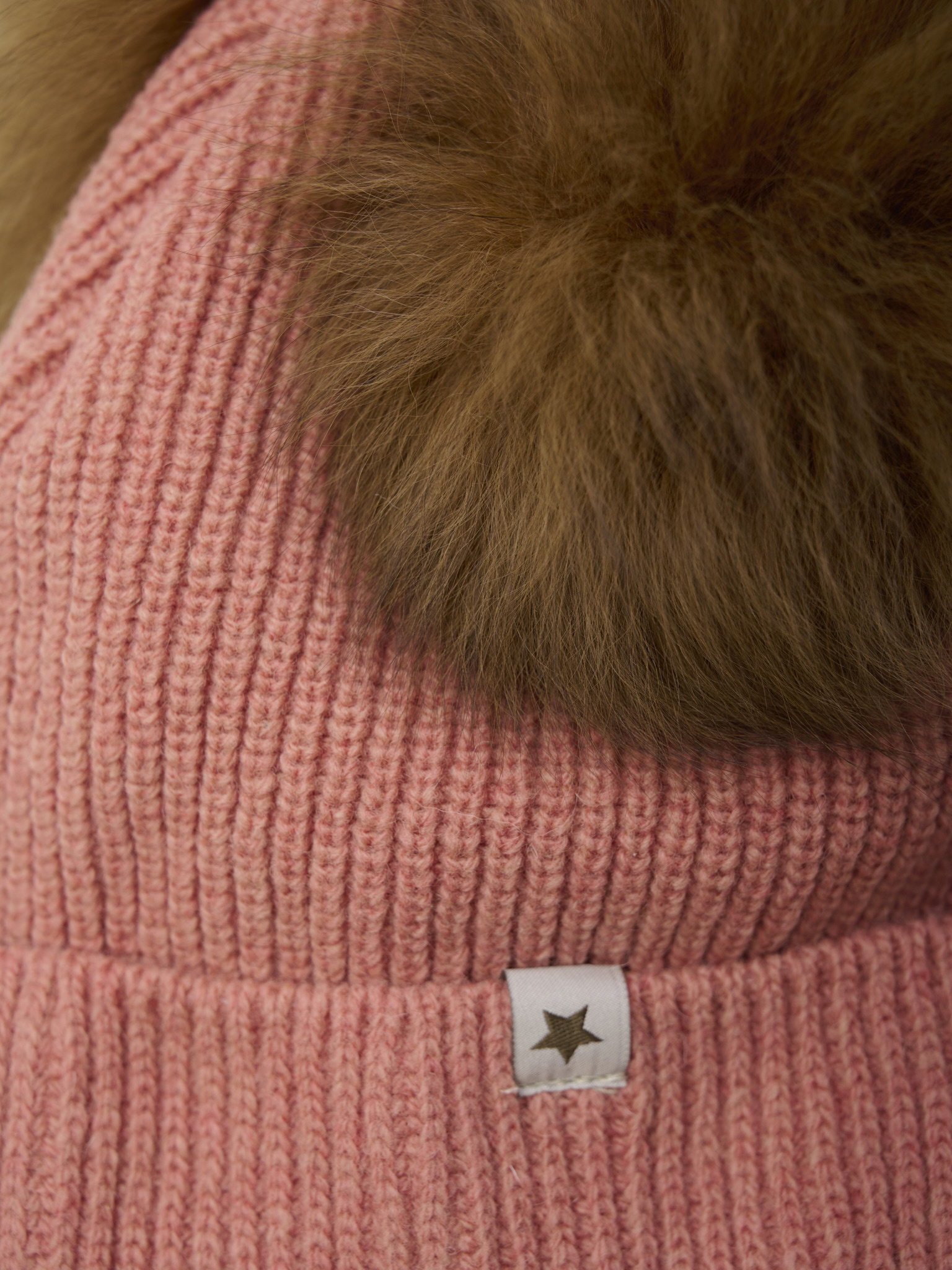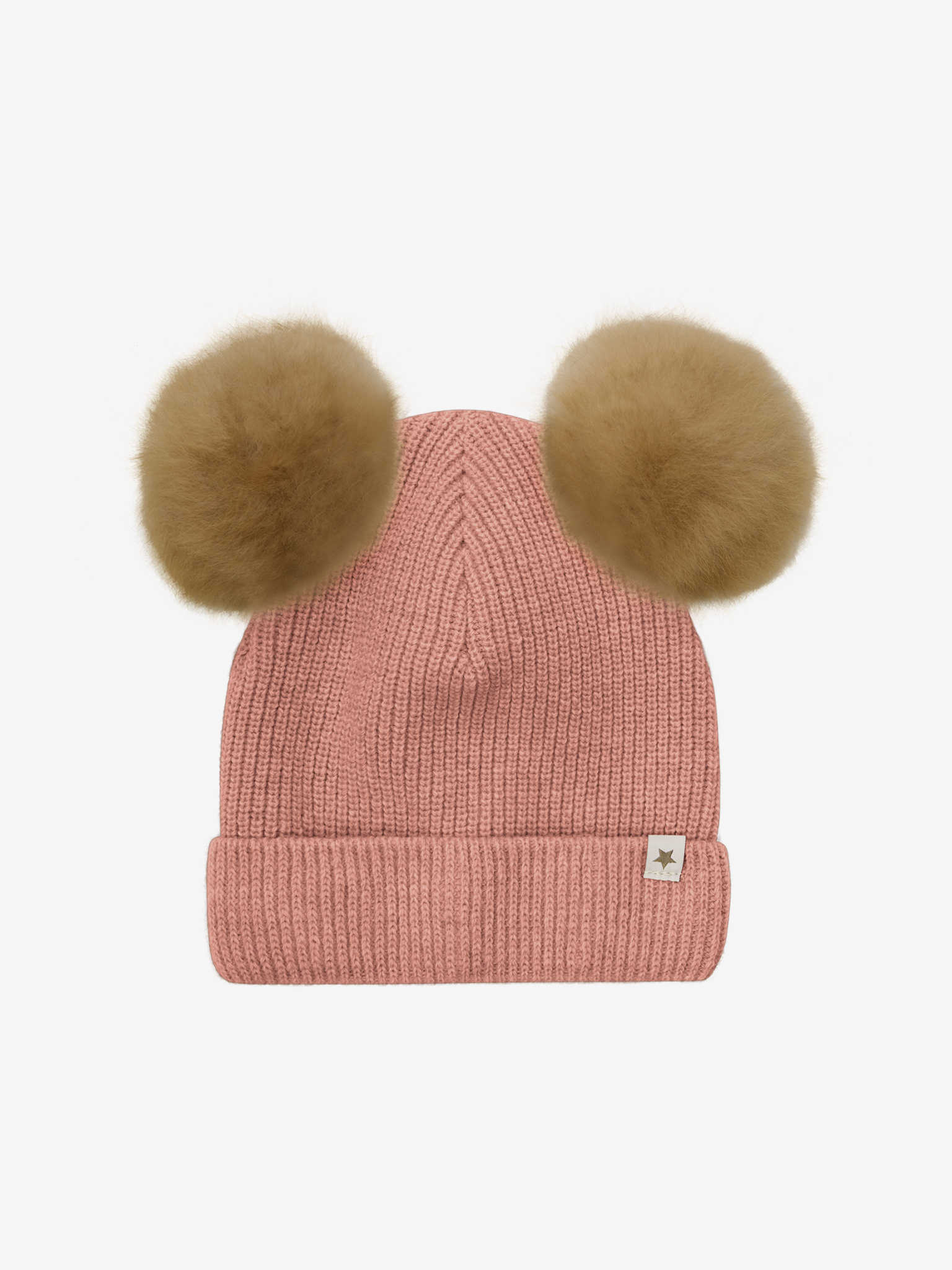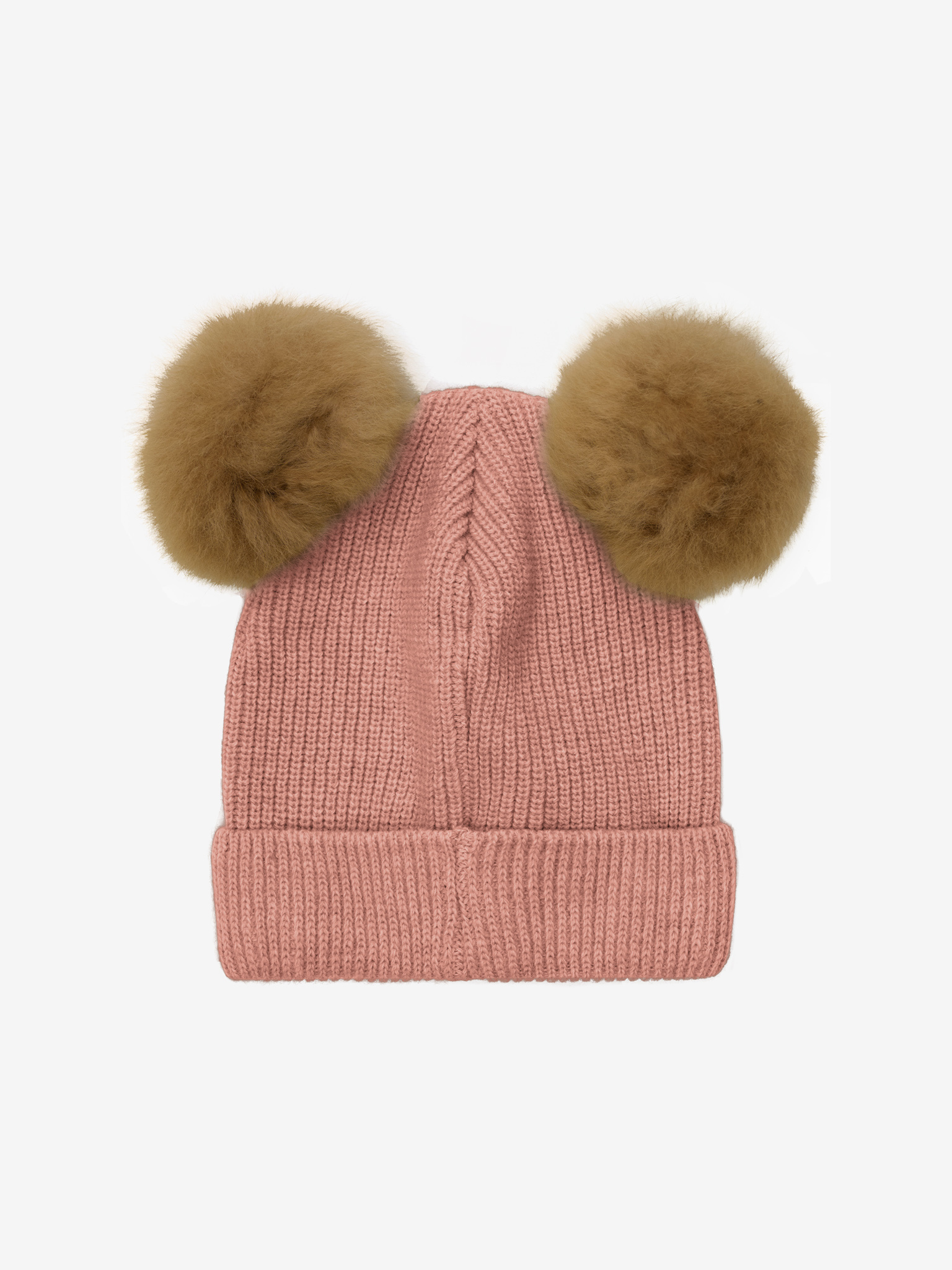 Lovely knitted HUTTEliHUT balaclava with two soft alpaca pom-poms on top of the head. The hat is in a thick knit for cold winter days. Inside the ribbed fold, is knitted with a soft cotton yarn.
