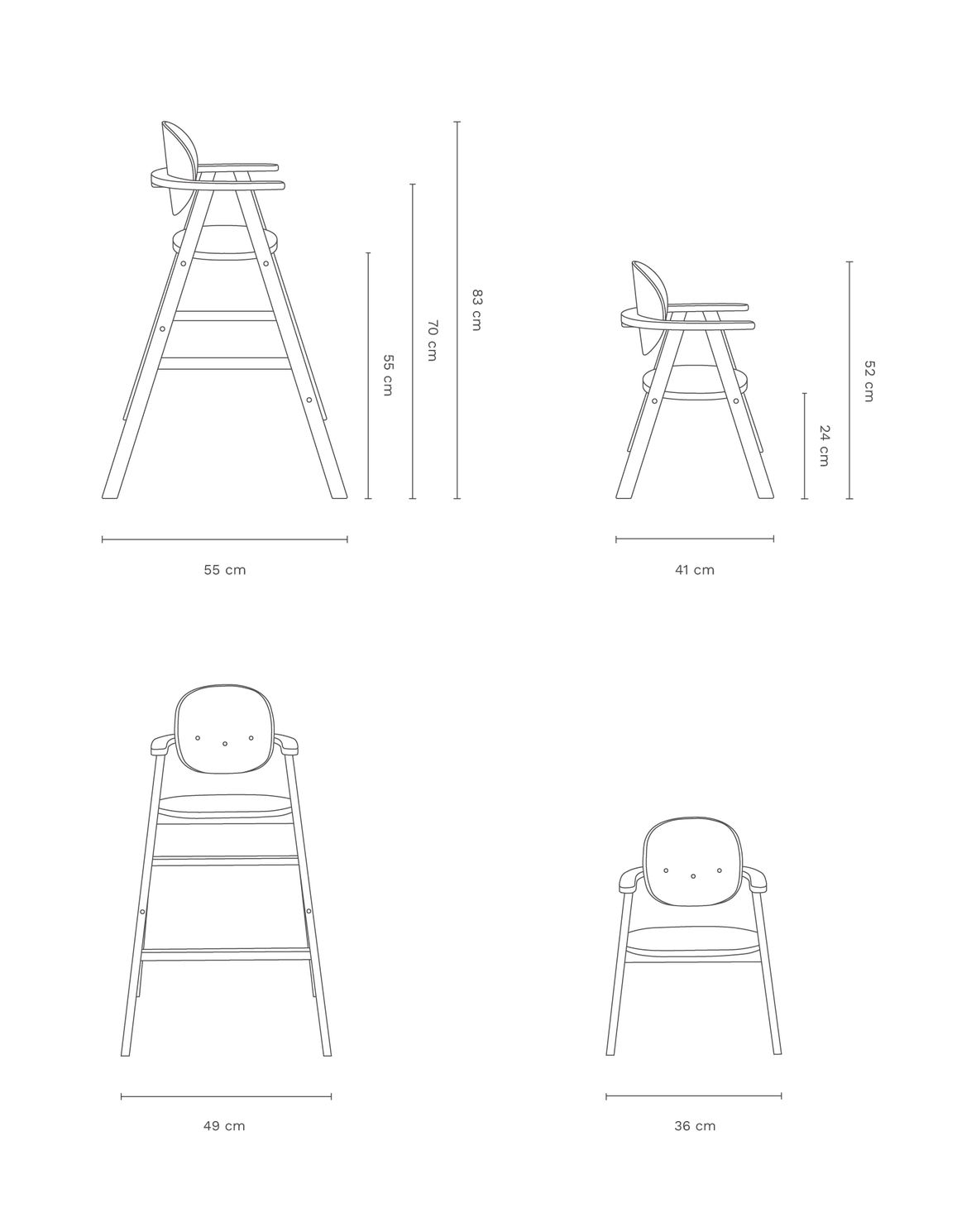 AfmetingenMeegroeistoel: - Van 3 maanden tot 6 jaar - 55 x 49 x 83 cm - Armleuningen: 70 cm - Hoge zitpositie: 55 cm, Lage positie: 24 cm; Dienblad: 47 x 35 x 2 cm