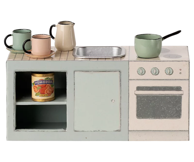The kitchen is the heart of every home. This metal kitchen has a beautiful colour and lots of playful details, such as a cupboard door, a sink and an oven with a freshly baked cake. The perfect size for the mouse family.