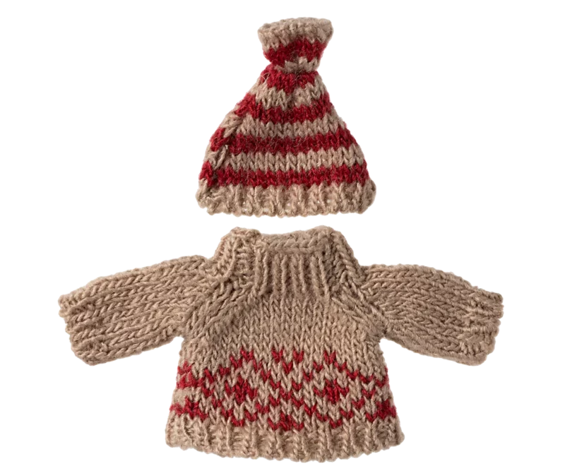 Big brother mouse dressed in classic santa clothes. He lives in a small house, and has a sack for all the presents he has to deliver on Christmas night. He fits perfectly into the bigger Maileg Gingerbread house as he can slide through the chimney.
