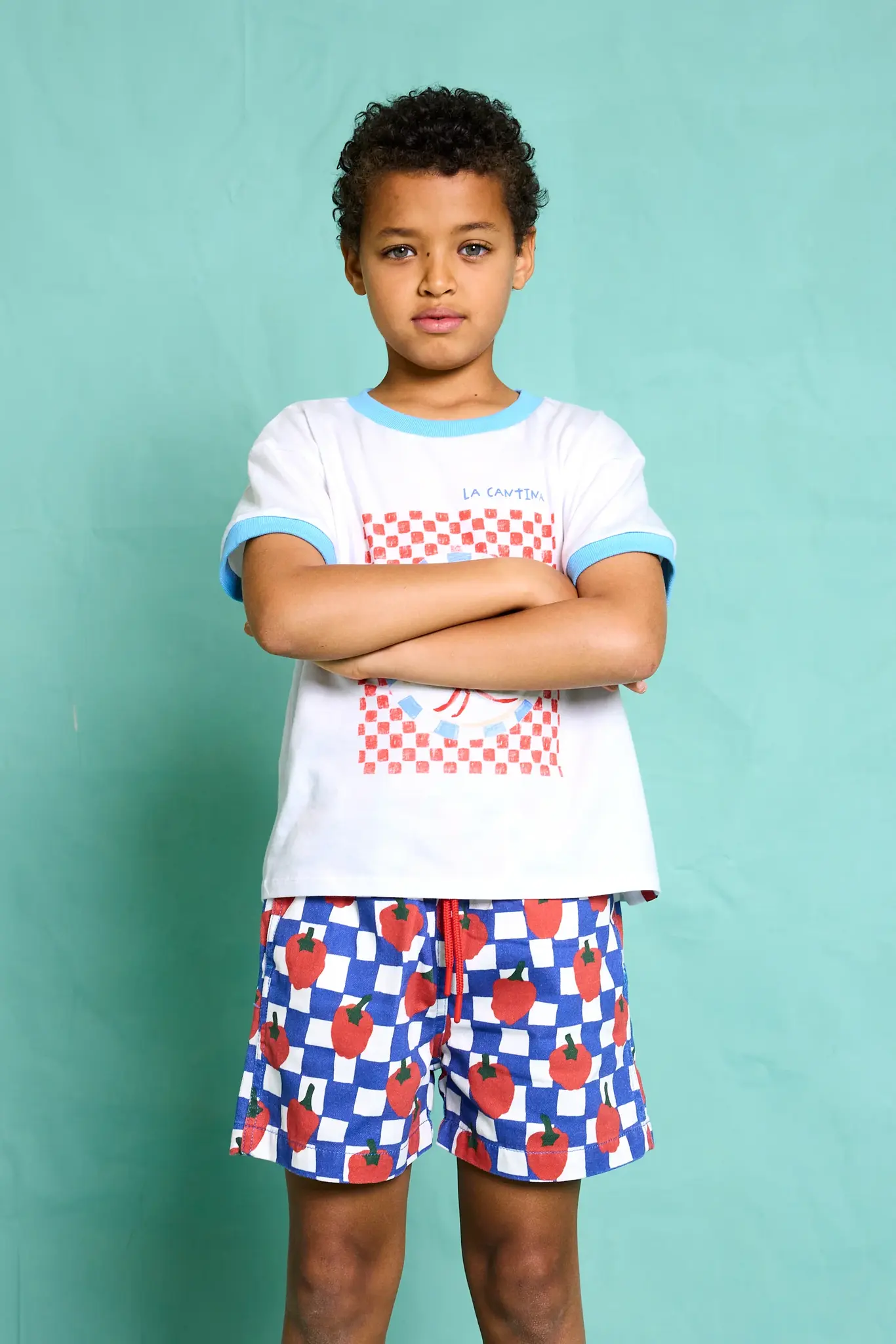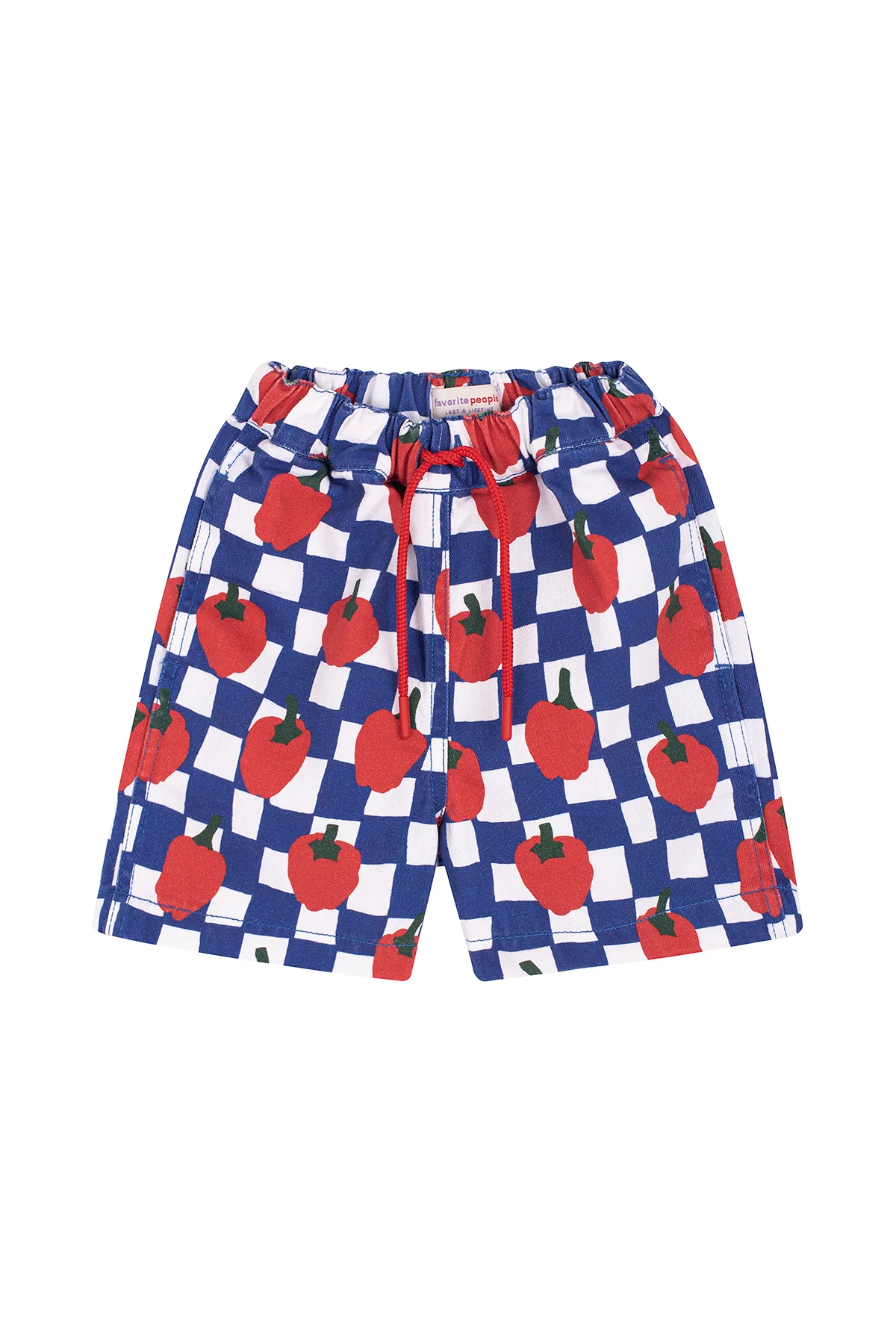 • These printed shorts in blue and white checkered pattern with pepper illustrations are made for sunny days and spontaneous play. Designed with an elastic waistband and a drawstring for a snug.