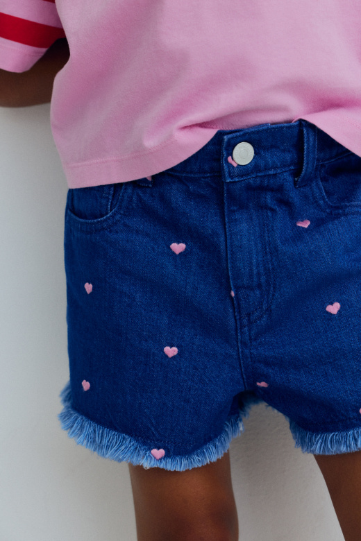 • Denim shorts with pretty all-over heart embroidery, featuring front and back pockets. Perfect for any summer day.