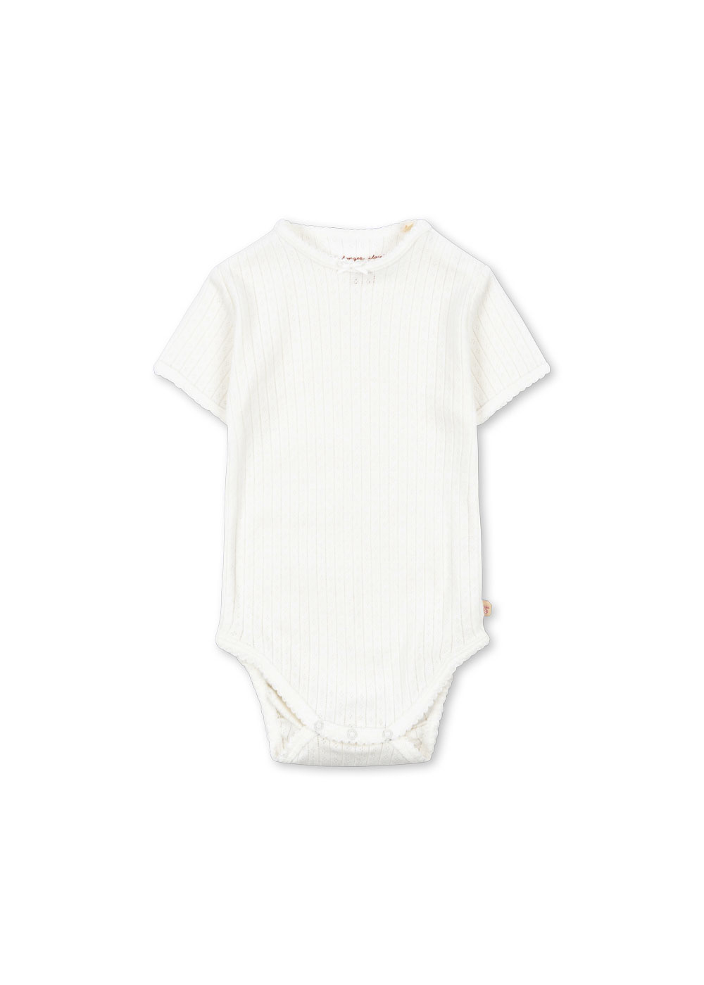 • Soft body with short sleeves. Crafted from 100% organic pointelle cotton with decorative picot edges. Designed with snap buttons at the crotch and shoulder for easy dressing and diaper changes.