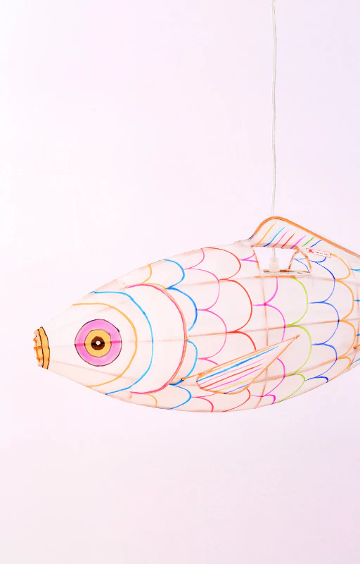 • Immerse yourself in the fabulous world of Petit Pan with the carp pendant light. Made from bamboo and hand-painted silk, this carp will gently illuminate your child's bedroom, bringing magic and dreams to life.