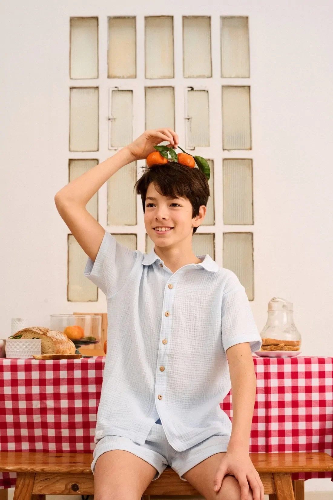 • Two-piece shirt-style pajama set with shorts and a short-sleeved shirt, made from 100% organic cotton double gauze with a light and super soft texture.