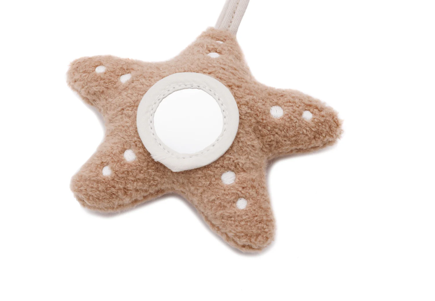 This cute Tiny Park car seat toy is the perfect toy for on the go. The design features an adorable dog, a kitten, and a four-leaf clover, which contains a small mirror for extra fun.