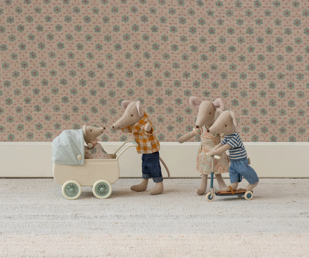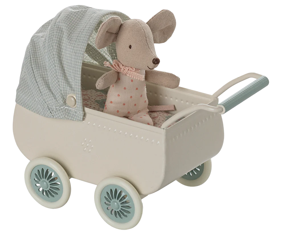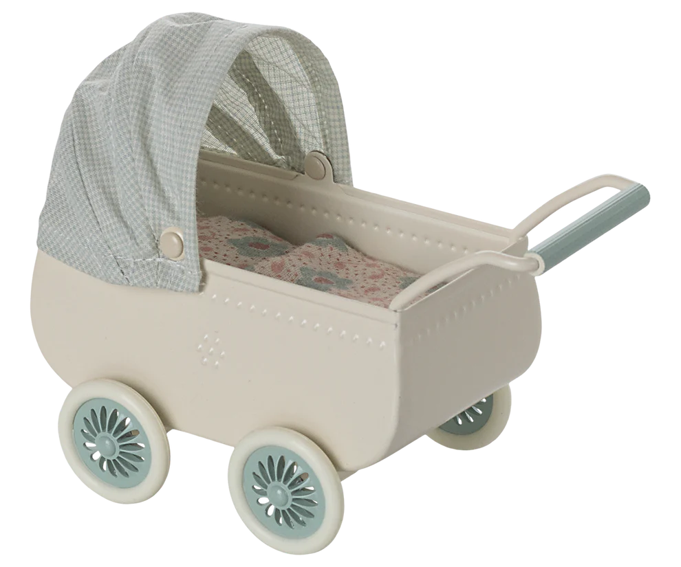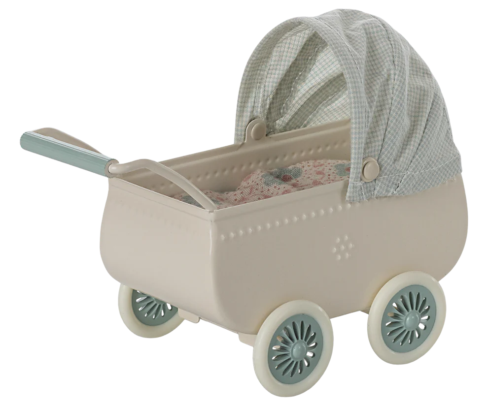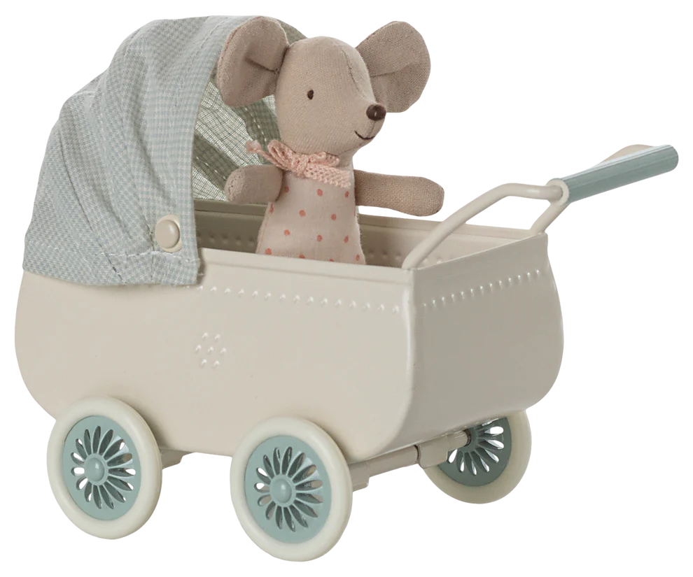 A sweet little carry cot for Maileg’s Baby Mouse, made from soft fabrics in a lovely light-blue shade. Perfect for taking your tiny mouse friend everywhere.