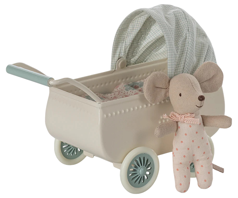 The beautiful pram has a vintage look and comes with a sleeping bag and a soft mattress. The pram is designed for all the baby mice so the parents can go for a walk with the little one.