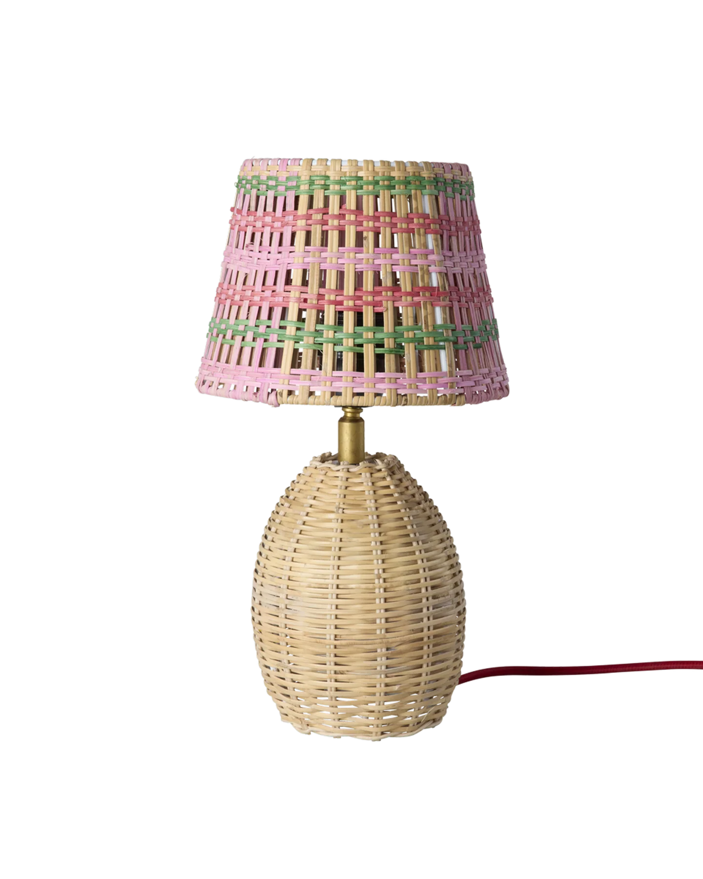 The cutest little table lamp with pink and green stripes. Both the shade and the lamp are handwoven in natural rattan, and the red cord features a practical on/off switch.