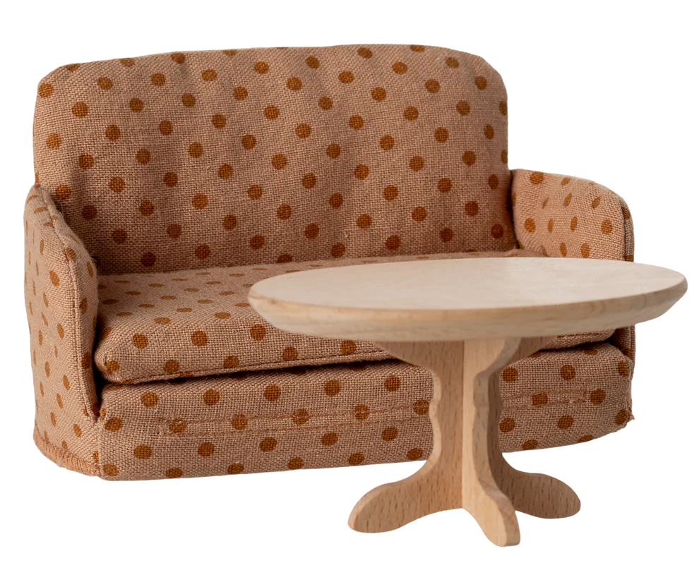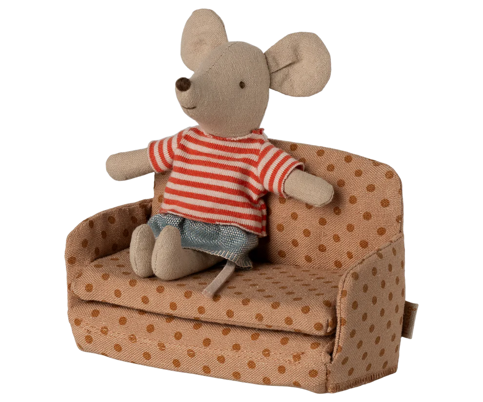 Mum mouse in light brown body fabric. She wears a dress and a bag with cheese holes. This mouse fits furniture and accessories in size mouse. Buy more clothes separately, clothes in size mum/dad fits this mouse.