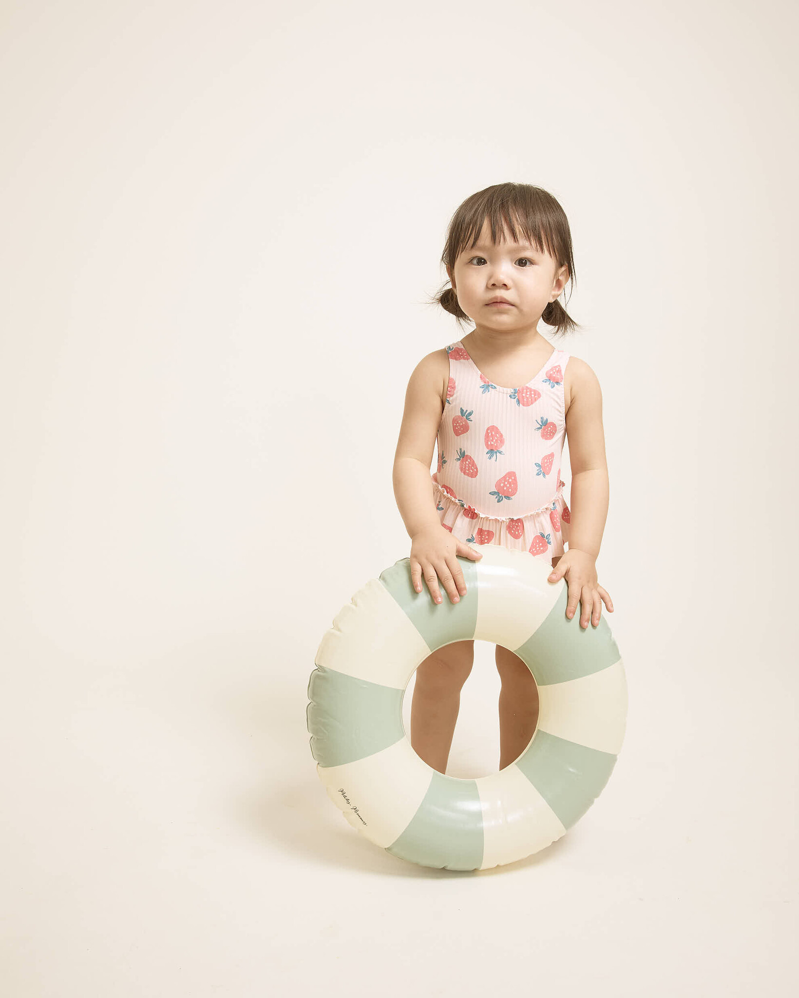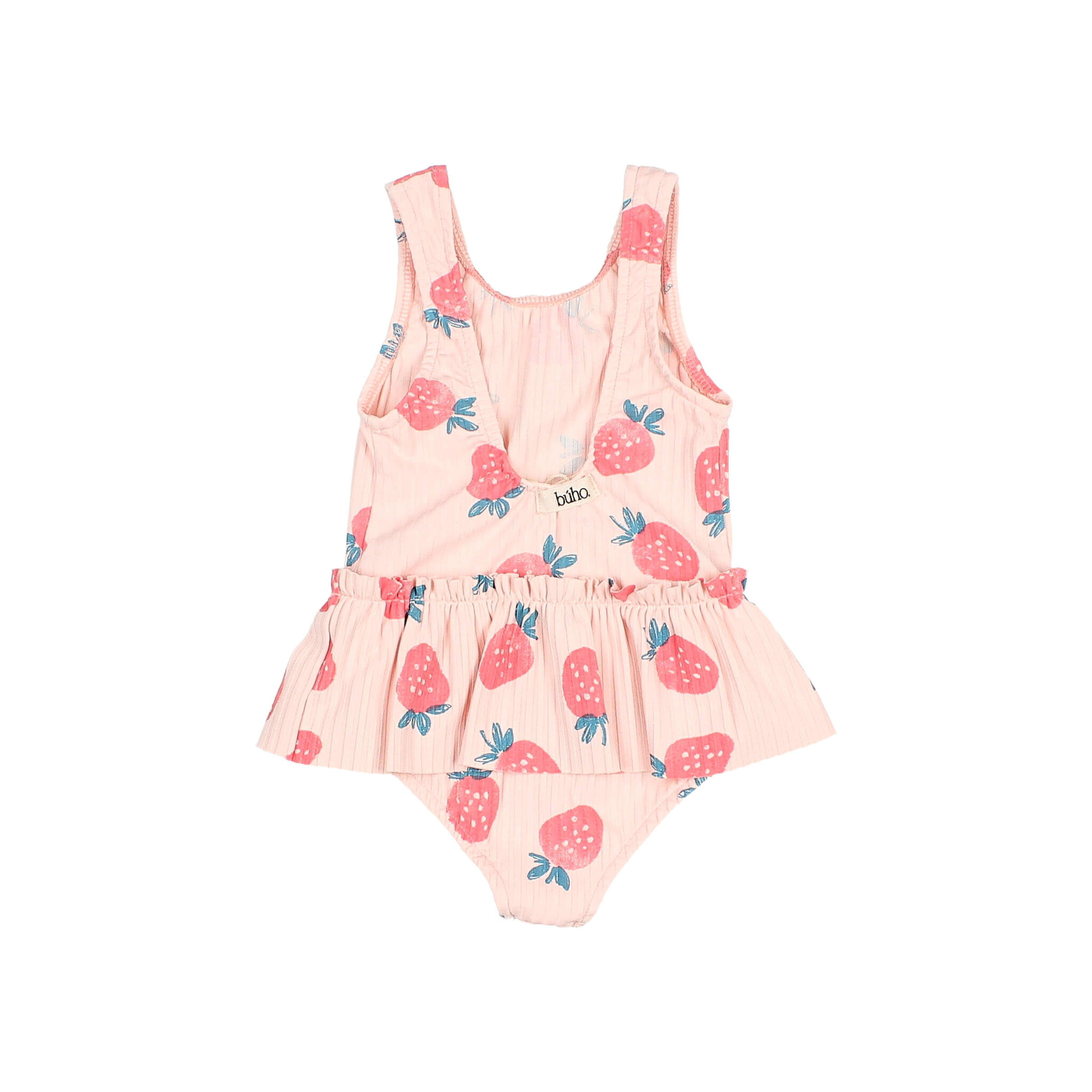 • Polyamide maillot with strawberry print. Gathered skirt at the waist. Round neckline.