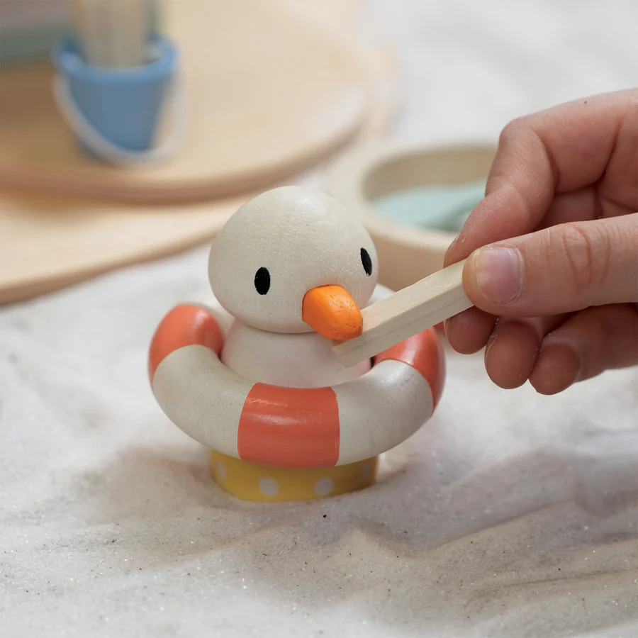 • Meet Sandy the wooden toy seagull and her family down on the beach where they have inhabited a small beach hut and turned it into a fish and chips stall.