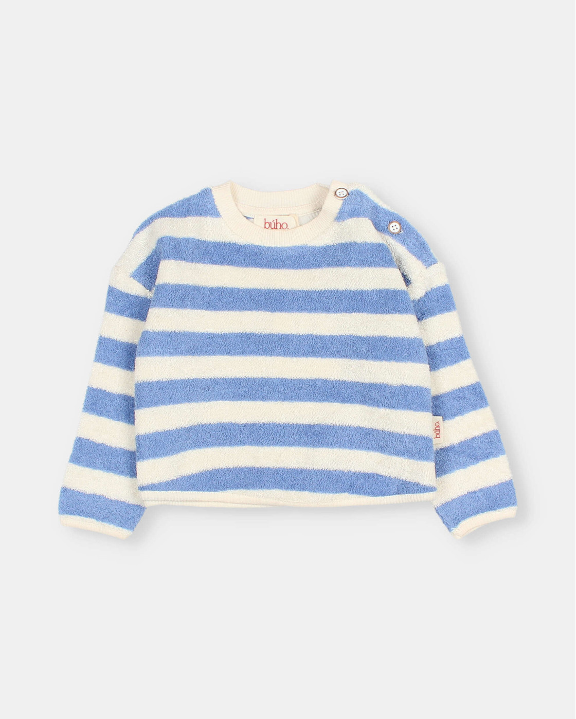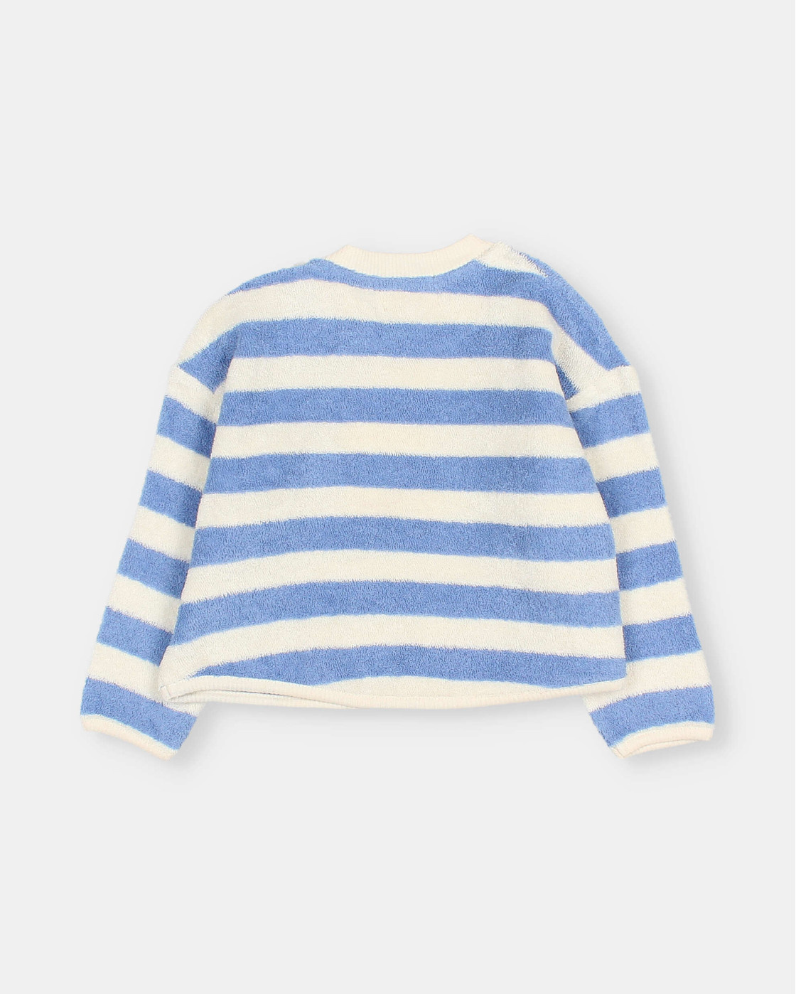 • Soft organic cotton terry sweatshirt with stripes. Long sleeves. Round neck with press stud fastening at the shoulder.