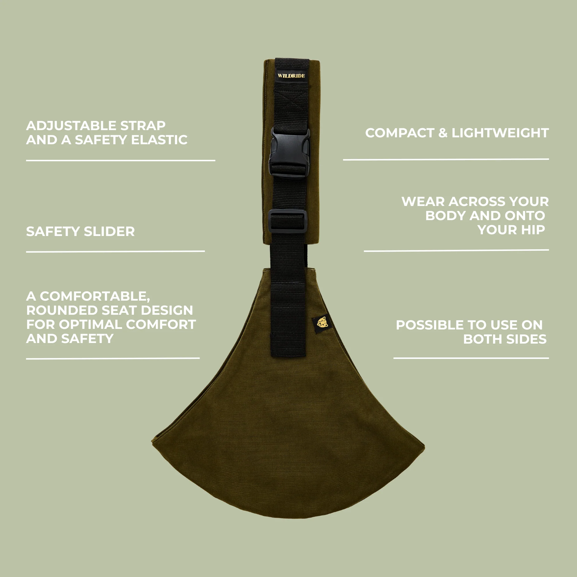 • The Wildride toddler carrier in army green testifies to timeless elegance and cherished moments. The soft hue evokes a sense of nostalgia and warmth, perfect for creating lasting memories with your little one.