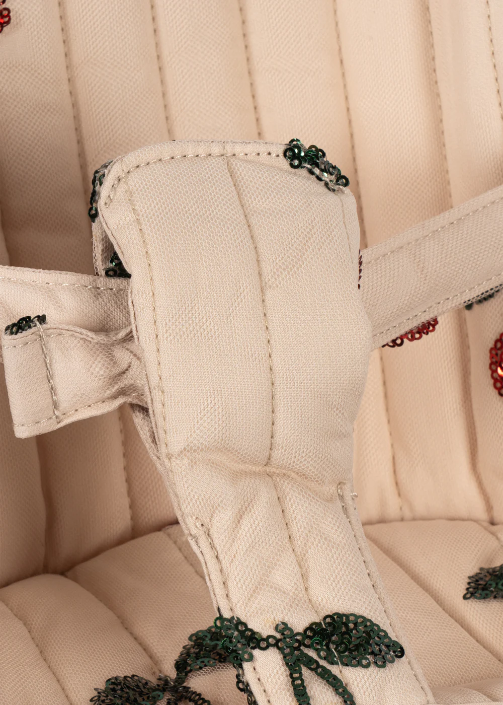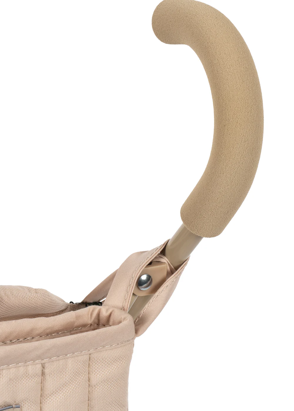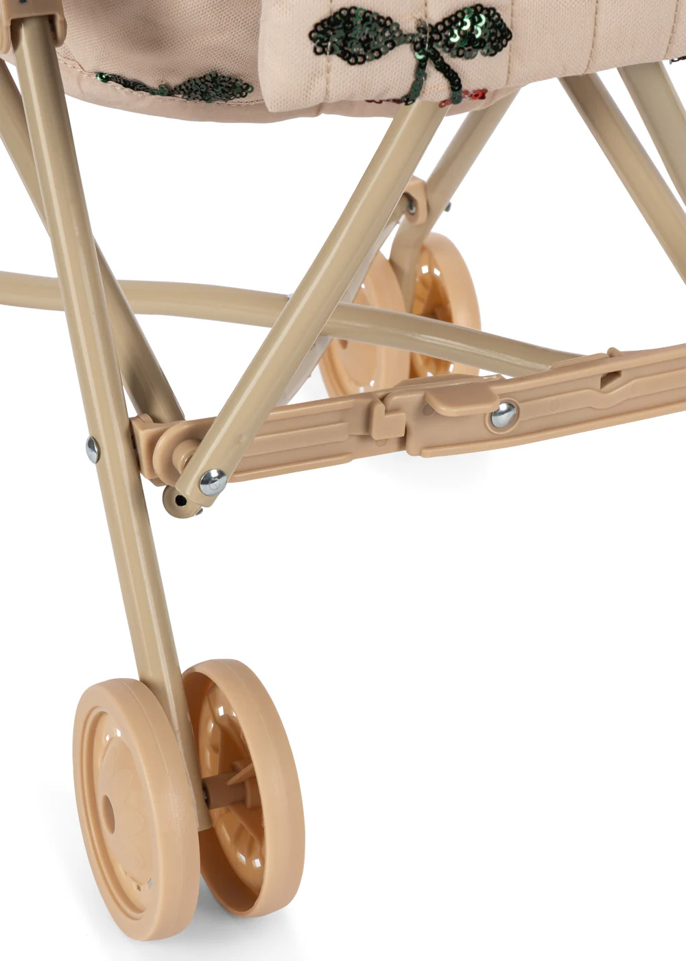 • Doll stroller designed with a harness, carriage bag, and double wheels on all four legs for extra stability. Features removable fabric.