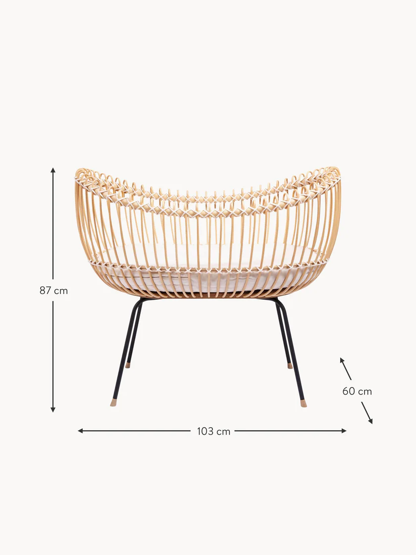 • Handgemaakt van puur natuurmateriaal, biedt het de wieg Lola van Bermbach een verfijnde mix van elegantie en vakmanschap. Het frame van rotan rust op een fijn metalen onderstel, terwijl kleine poten van mangohout zorgen voor een zachte vloerondersteuning.