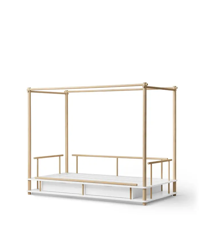 Het eikenhouten bed, met zijn prachtige vakmanschap, verborgen schroeven en praktische lades aan de onderkant, kan gemakkelijk op zichzelf staan, maar het ontwerp komt pas echt tot zijn recht met een van de voor het bed ontworpen hemels. Het hemelbed, gestyled met een van de vier hemels, nodigt uit tot allerlei uitingen, scenario's en universums, en creëert een veilige omgeving voor de nacht en een platform voor dagdromen en spelen overdag.