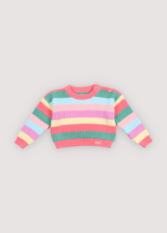 Het klassieke gestreepte katoenen breipatroon, met zomerse kleuren en een charmant geborduurd logo-detail op de borst. Voorzien van een schouderopening met houten knopen.