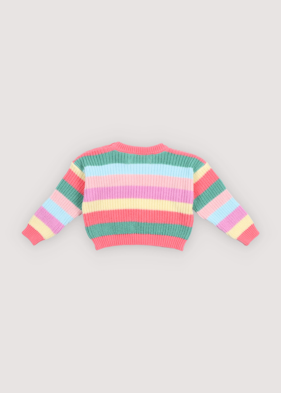 Een fijne katoenen gebreide trui met mooie veelkleurige hartjes en een schouderopening met houten knopen. Perfect te combineren met de bijpassende bloomer.