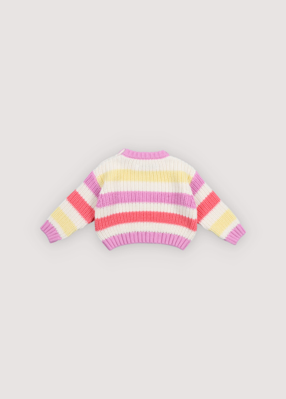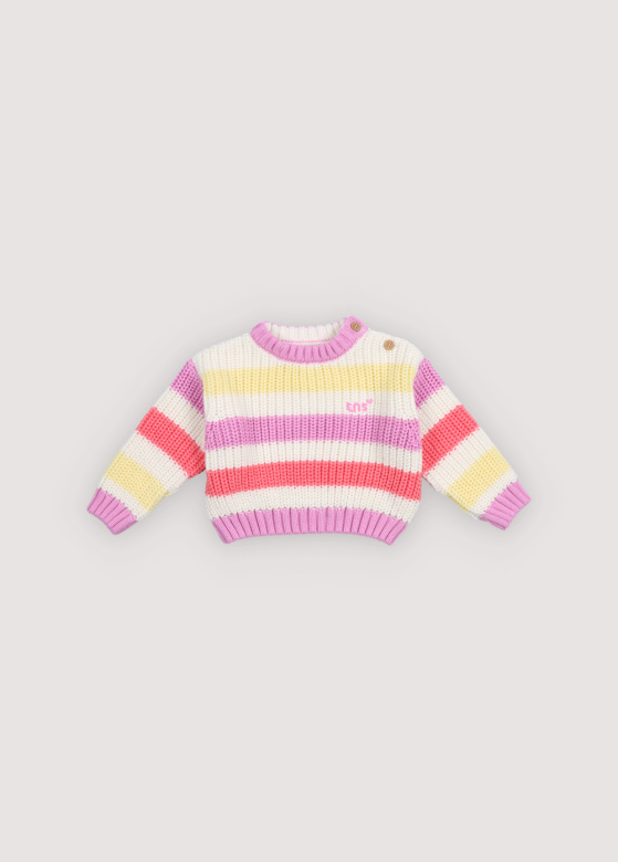 • Het klassieke gestreepte katoenen breipatroon, met zomerse kleuren en een charmant geborduurd logo-detail op de borst. Voorzien van een schouderopening met houten knopen.