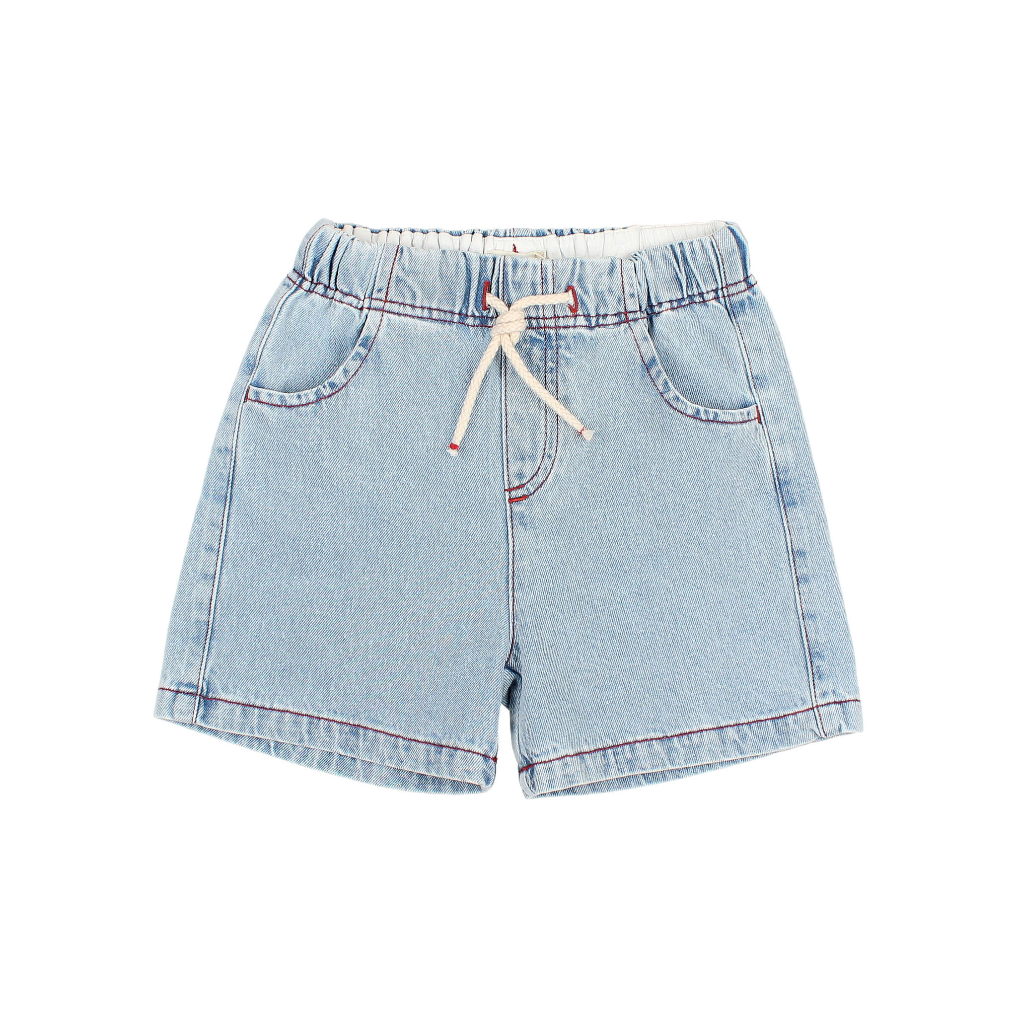 • Lichtgewassen denim bermuda. Elastische tailleband met katoenen trekkoord voor een betere pasvorm. Voorzakken en opgestikte zakken aan de achterkant.