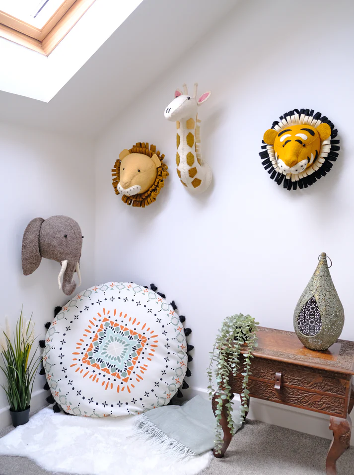 De vilten dierenhoofden van Fiona Walker zijn dé eye-catchers voor in een slaapkamer, speelkamer of woonkamer. Elk dierenhoofd is handgemaakt en heeft daarom een eigen uniek karakter. Ze zijn gemakkelijk aan de muur te bevestigen met het haakje achteraan.