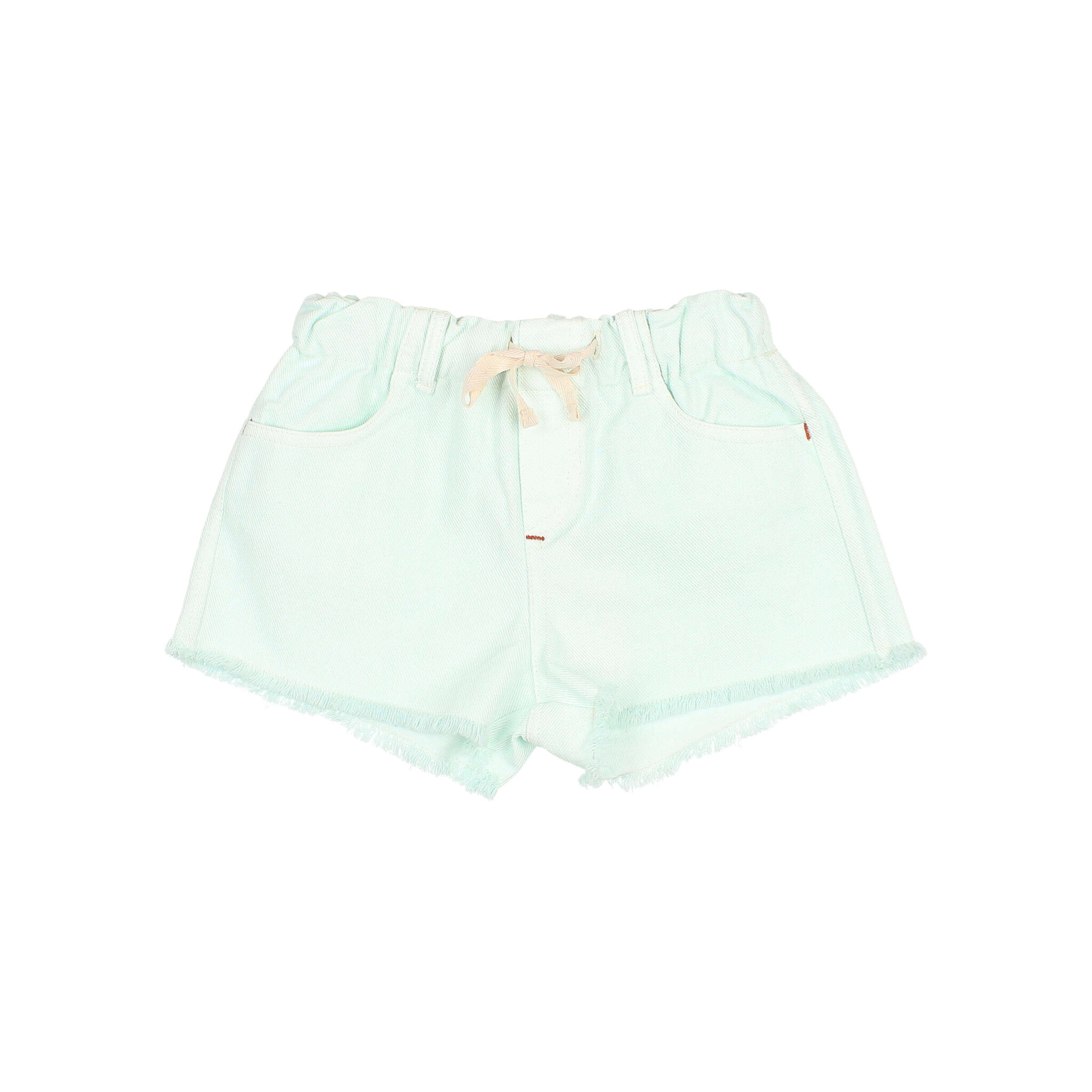 • Katoenen korte broek. Elastische tailleband met riemlussen en ruw katoenen lint om te verstellen. Voorzakken en opgestikte zakken aan de achterkant.