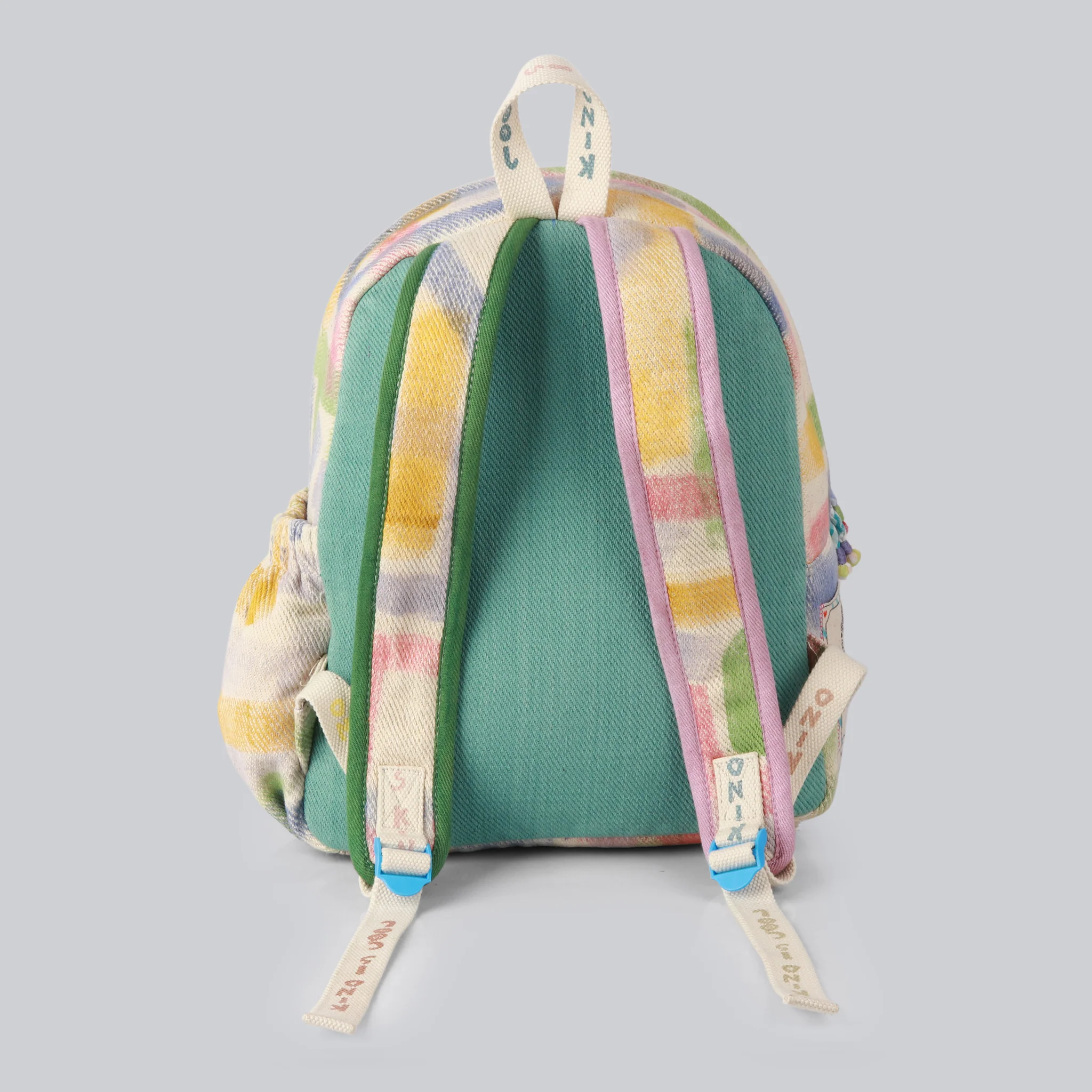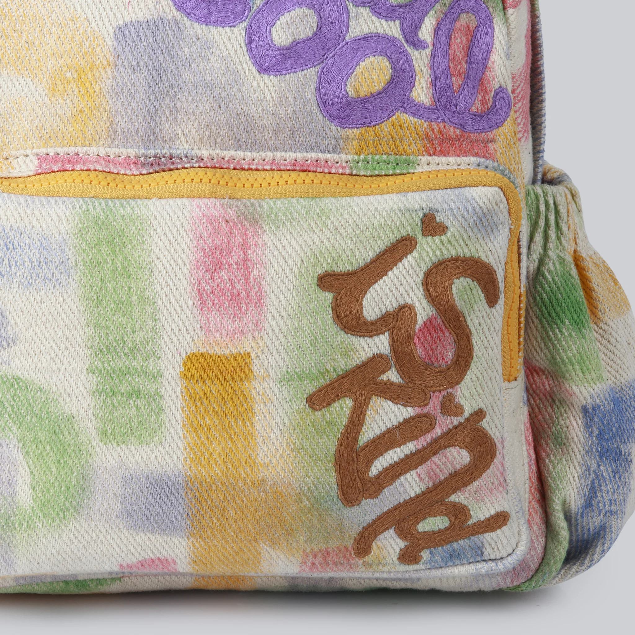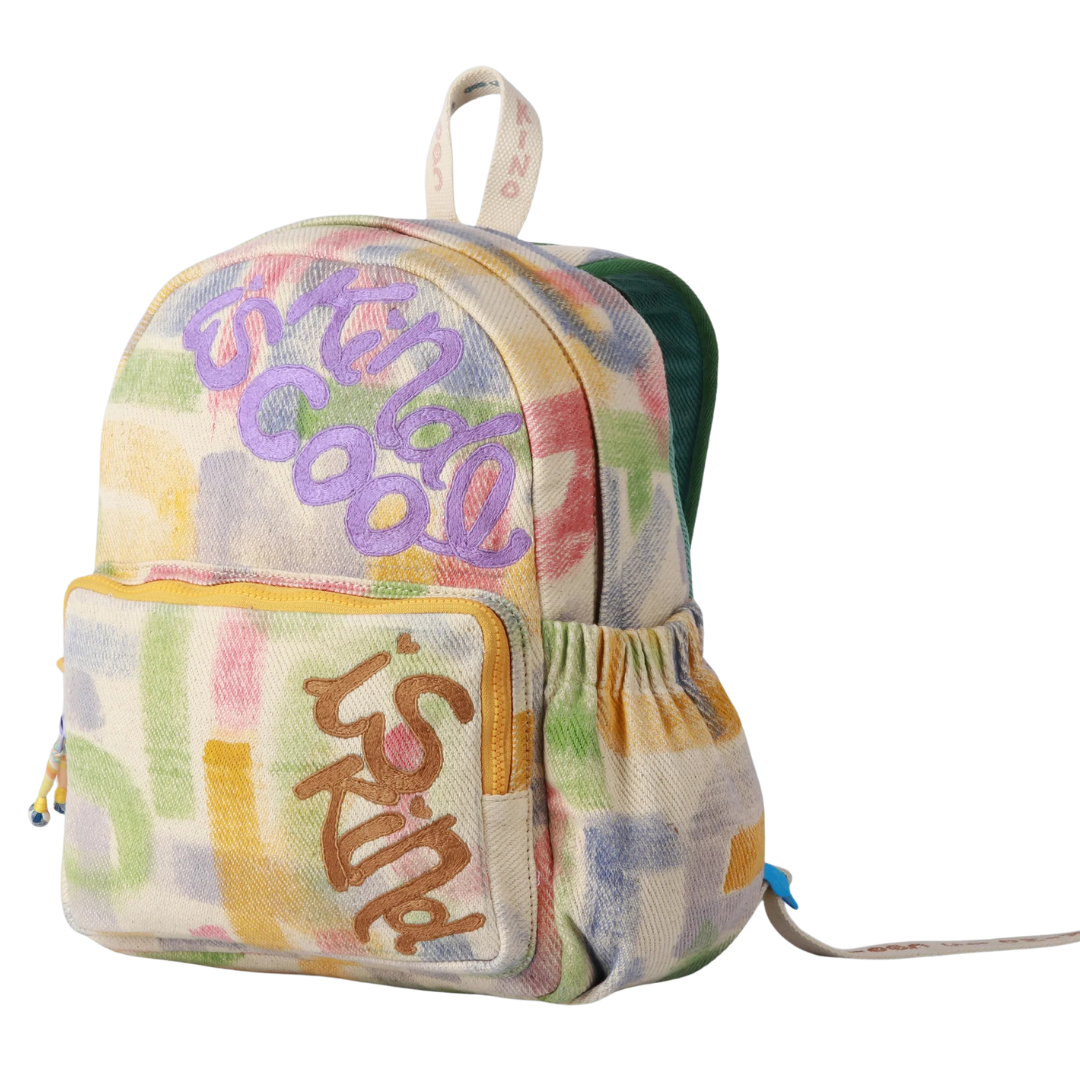• Deze tas is gemaakt van stof met een alfabetisch penseelstreekprint en heeft een kleurrijk en speels ontwerp. De geborduurde tekst luidt: “Kind is cool, cool is kind.” Dus pak je tas en geniet 365 dagen lang van zomerplezier!
