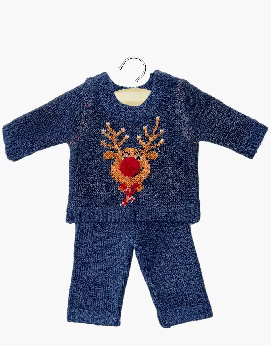 Stijlvolle 2-delige Minikane tricotset Petit Renne Vert met bijpassend pochon. Past op 34 cm en 28cm poppen. Zachte, rekbare stof en ideaal voor rollenspel of cadeau.