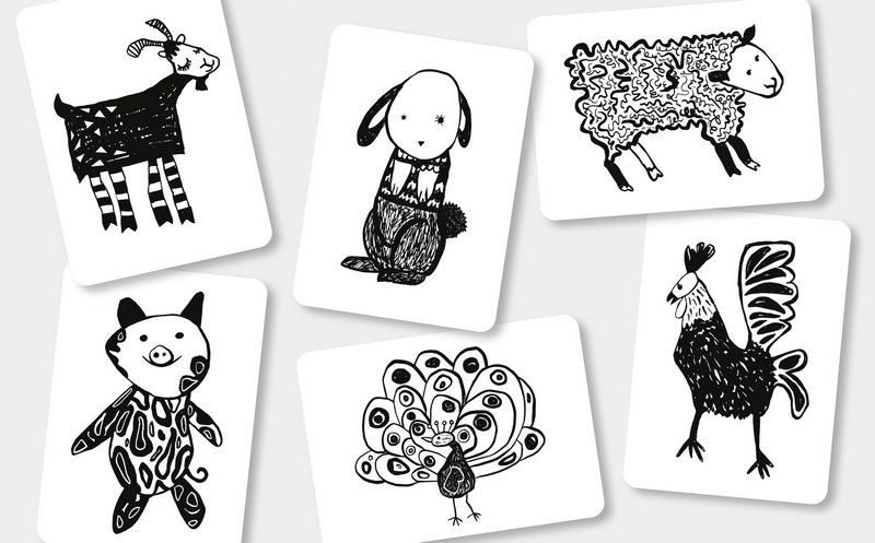Creatieve zwart-wit kijkkaarten die speciaal zijn ontworpen voor de allerkleinsten. Pasgeborenen kunnen slechts tot 30 cm zien en, naast het gezicht van hun ouders, zijn ze het meest gefascineerd door afbeeldingen, vormen en patronen met een hoog contrast