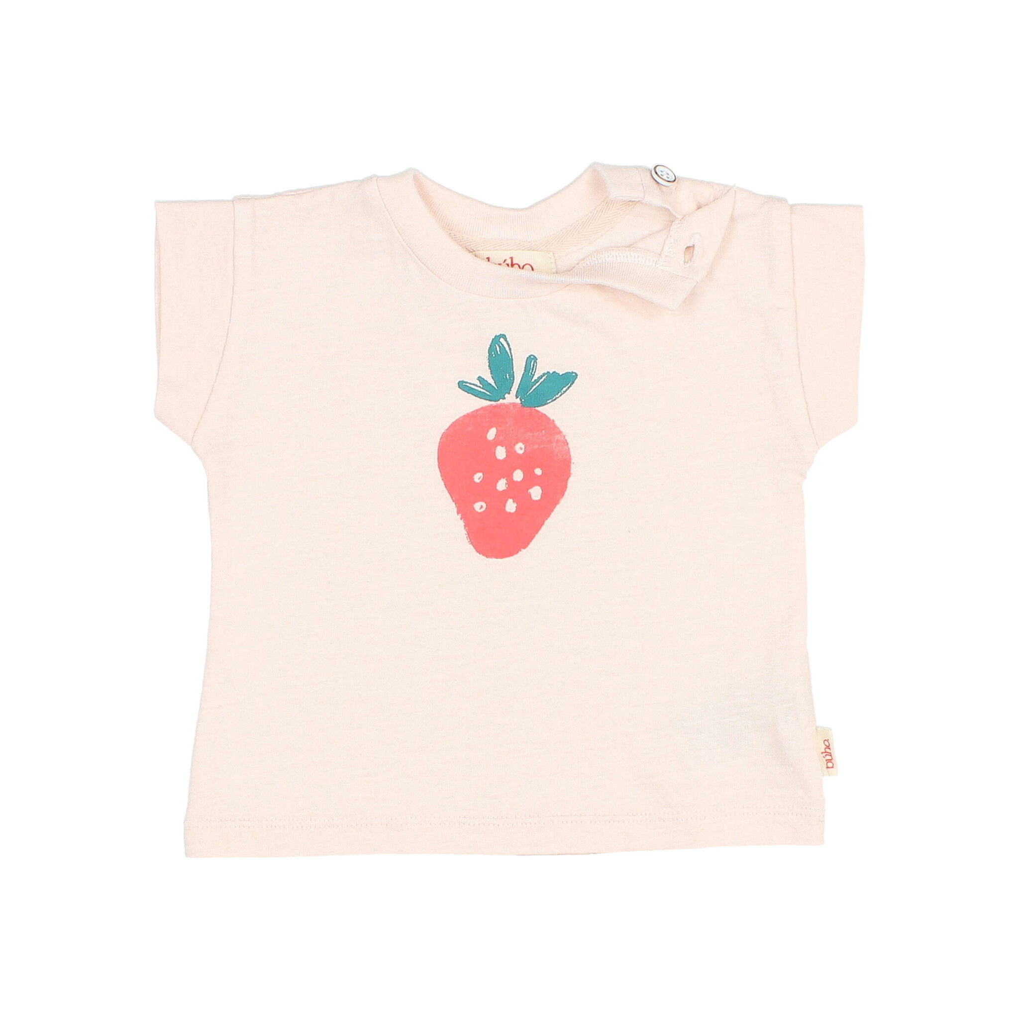 • Biologisch katoenen T-shirt met aardbeienprint op de borst. Ronde hals met knoopsluiting op de schouder. Korte mouwen met omslag.