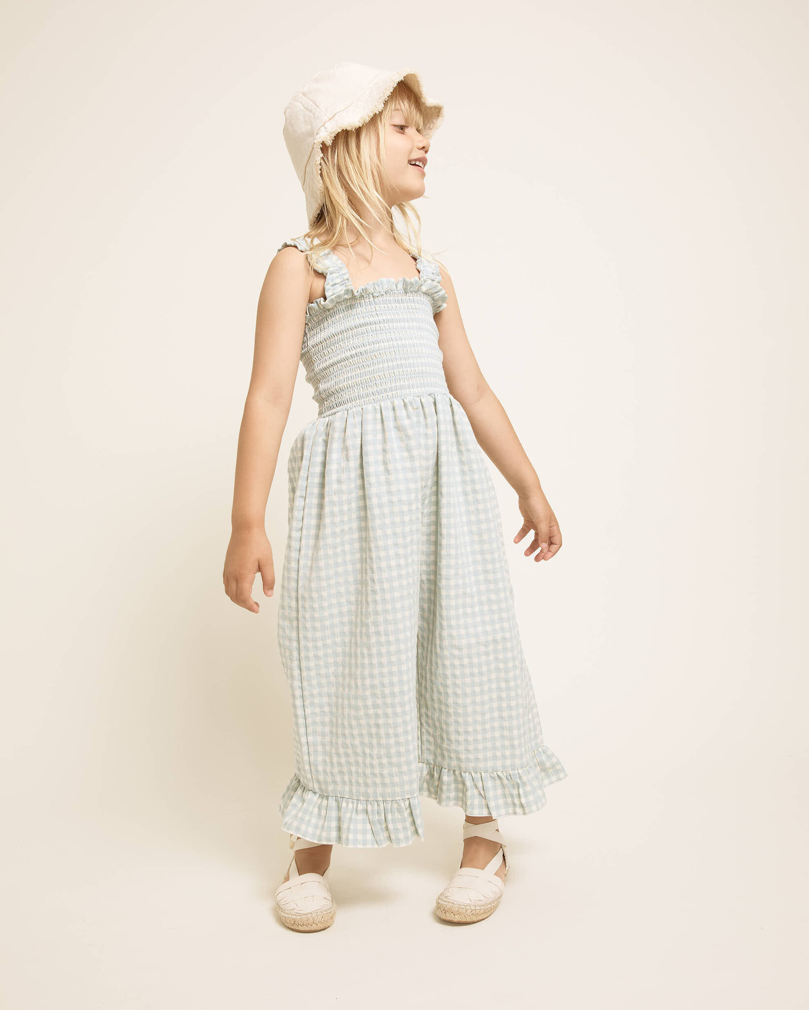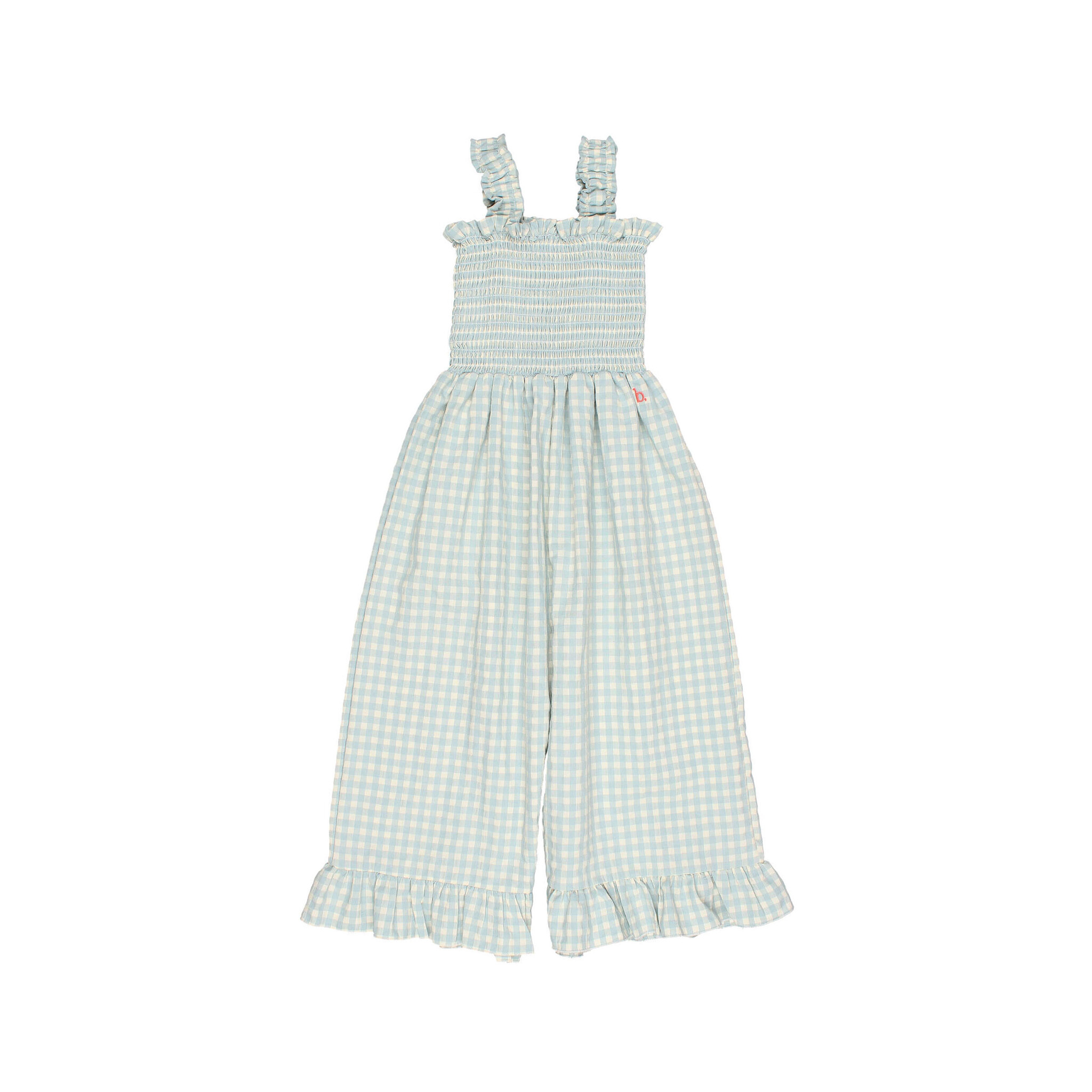 • Lange jumpsuit met ginghamprint van katoenen seersucker. Rechte halslijn met ruches. Bandjes met elastiek en ruches. Bovenstuk met elastiek. Wijde rechte broek.