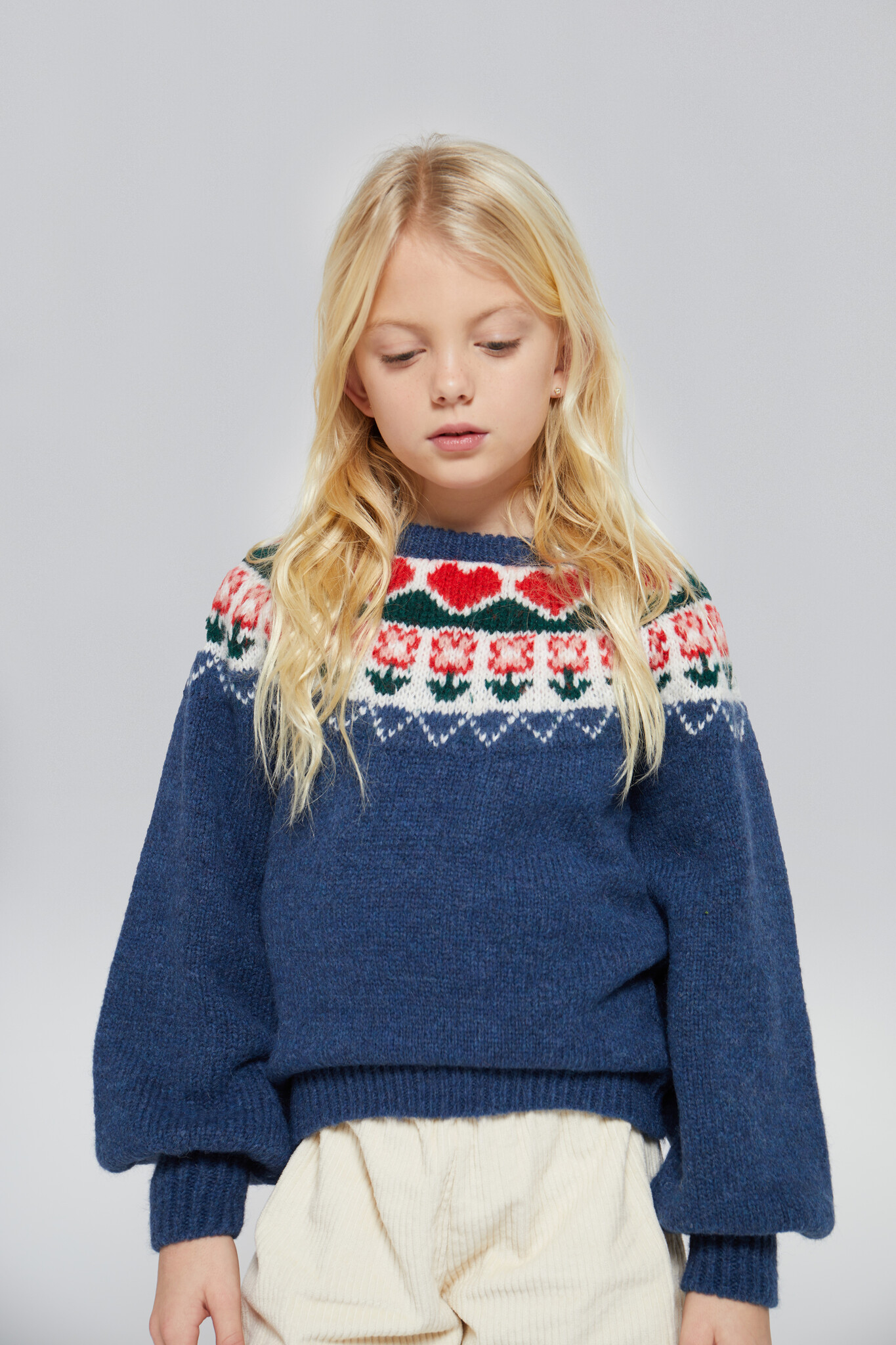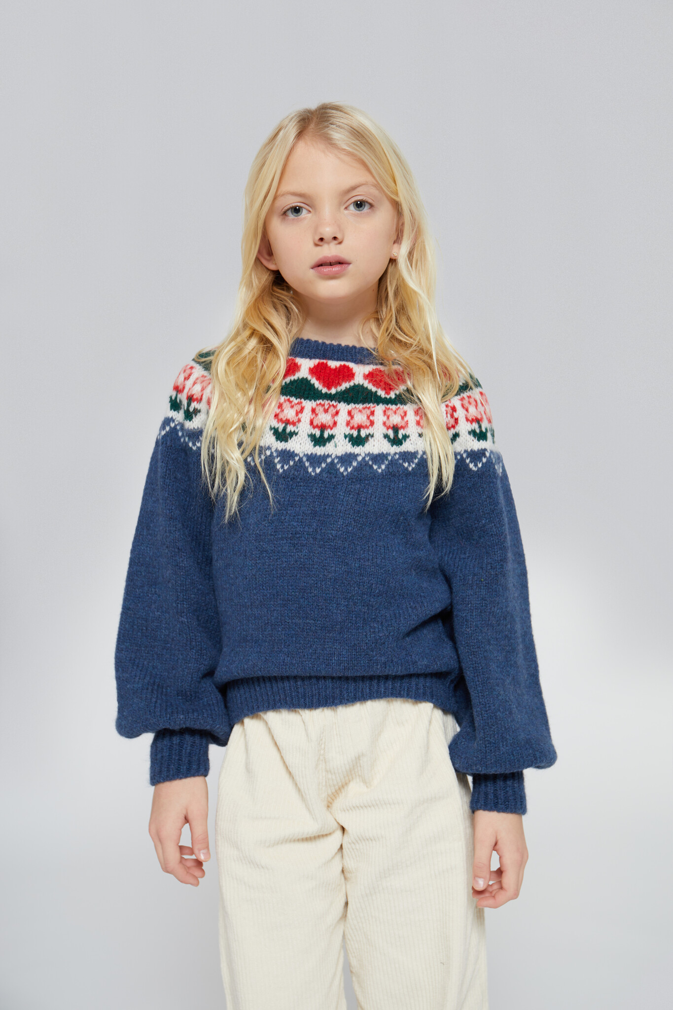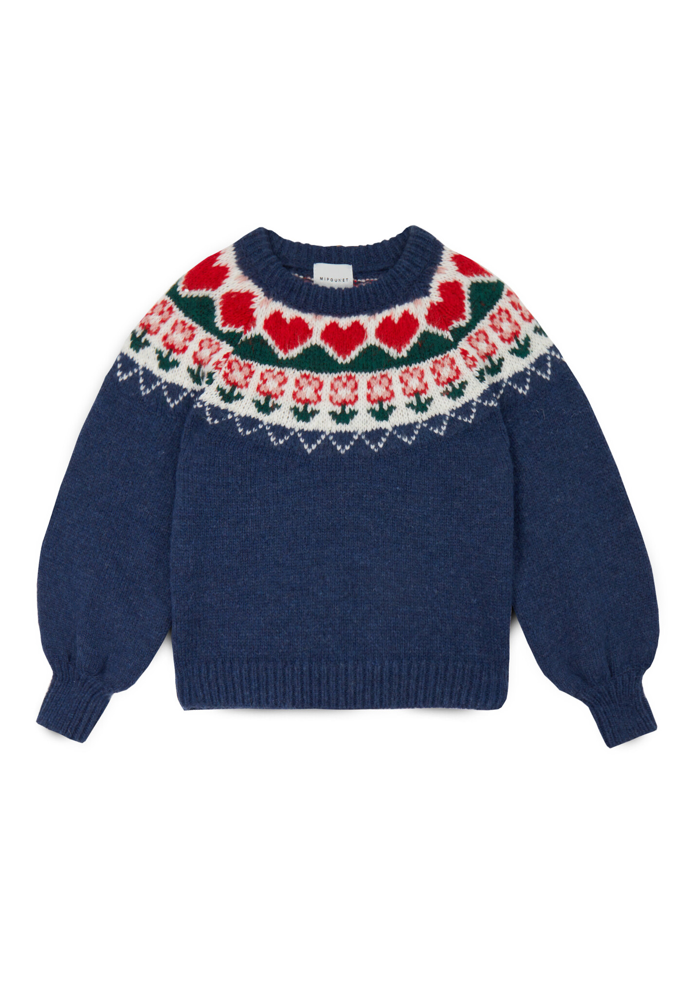 Bij MIPOUNET zijn ze dol op een kersttrui. Greta moet wel een van hun meest romantische stijlen tot nu toe zijn, met dromerige hartjes en gedefinieerde bloemmotieven die de schouders sieren.