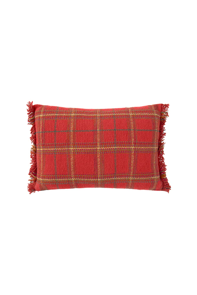 • Een gezellig kussentje met een Brits tintje! Handgeweven met traditionele weefgetouwen en uitgevoerd in een warme Maple Red-kleur. De franjeranden geven het een speels tintje, perfect voor de kamer van je kleintje.