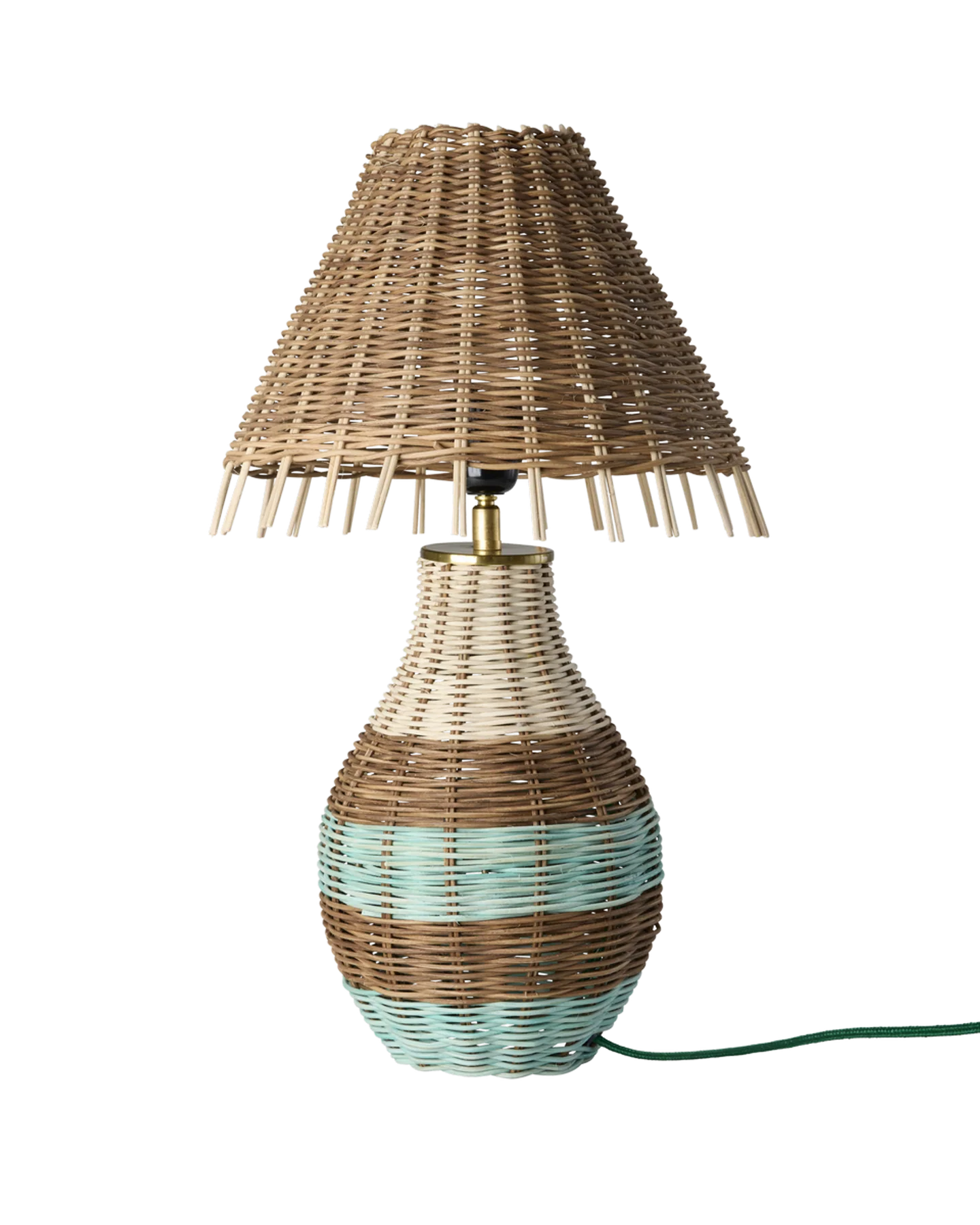 De schattigste rotan lamp met roze en groene strepen. Zowel de kap als de lamp zijn met de hand geweven van natuurlijk rotan en het rode snoer is voorzien van een praktische aan/uit-schakelaar.