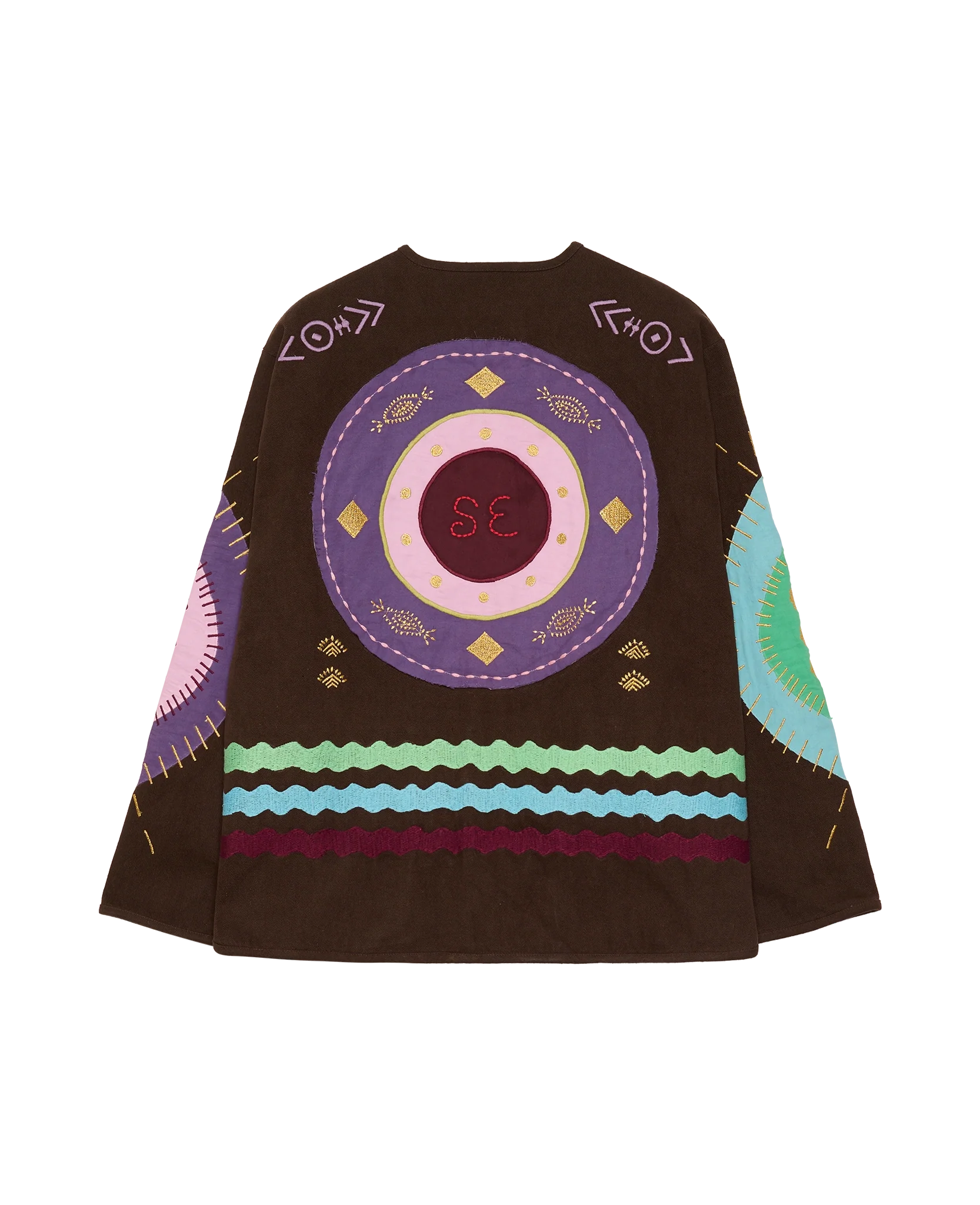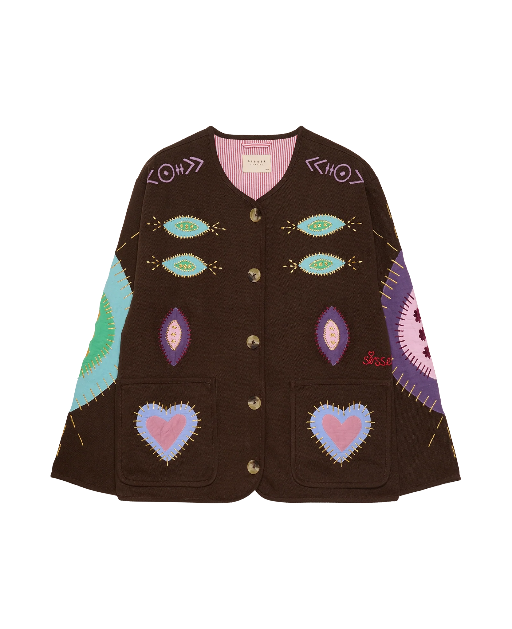De opvallende, charmante uitstraling wordt benadrukt door de gedurfde, kleurrijke motieven die zijn gemaakt met applicaties van restjes stof en borduursels. Het jasje is afgewerkt met biezen aan de randen in de hoofdstof en is gevoerd met katoen.