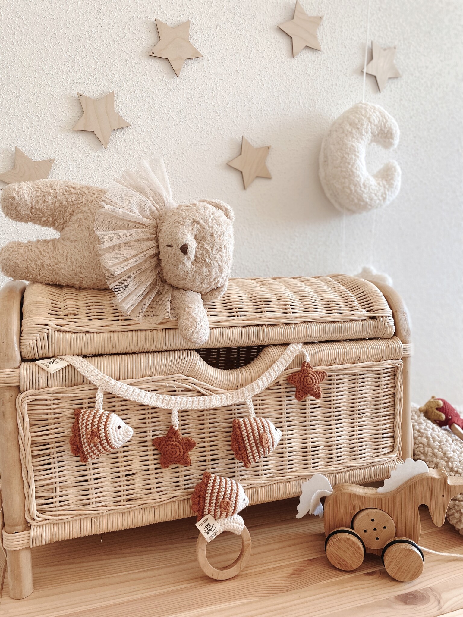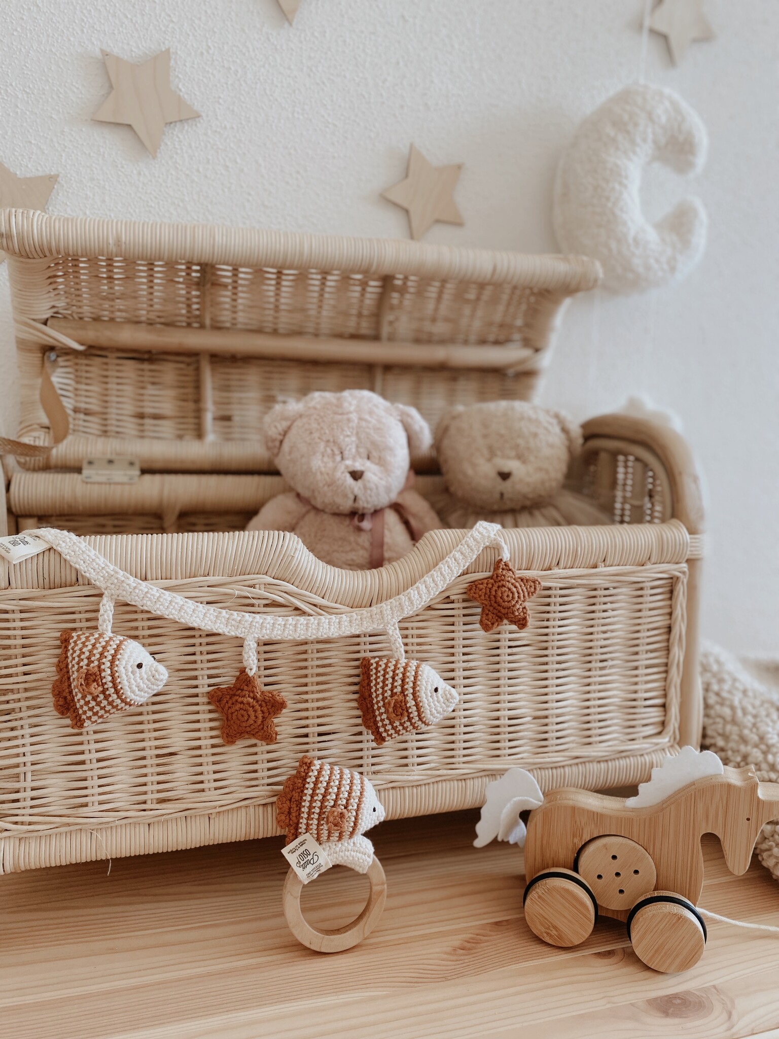 Zacht en zoet als het fruit. Deze Aardbeienwagenketting is het perfecte cadeau voor een sprookjesbos-sfeer, zacht en makkelijk vast te pakken. Ideaal speelgoed om je baby te stimuleren met verschillende vormen en geluiden.