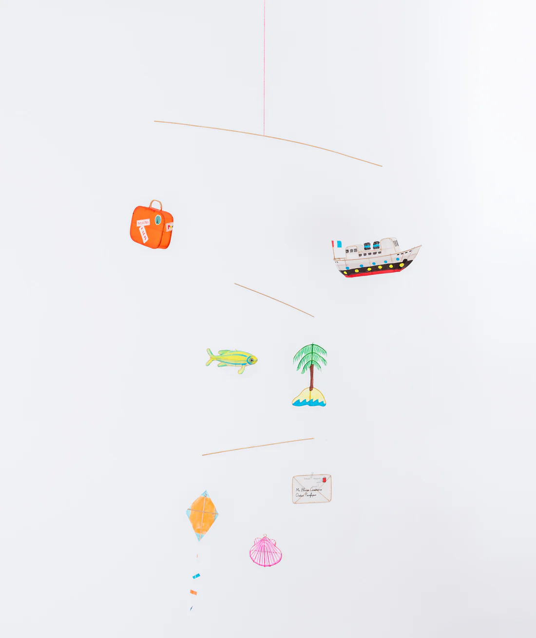 • Dompel jezelf onder in de fantastische wereld van Petit Pan met de reismobiel. Deze mobiel bestaat uit een boot, een kleine koffer en kleine voorwerpen die met reizen te maken hebben en is verfijnd en poëtisch.