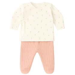• Zachte newborn set van OEKO-TEX® STANDARD 100 gecertificeerd katoen met overslagshirt en voetjesbroekje, ontworpen om je baby in de eerste maanden makkelijk aan te kleden. Onmisbaar in de ziekenhuistas. Combineer met het bijpassende mutsje.