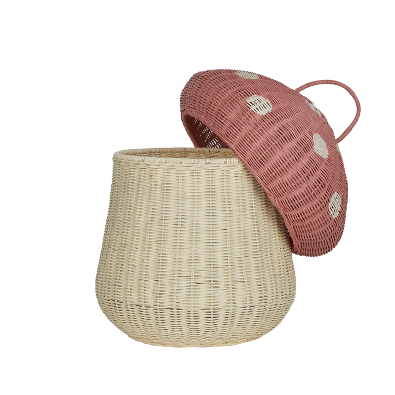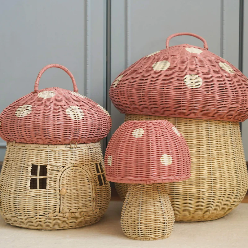 Maak kennis met de rode en crèmekleurige paddenstoelenmand - een magische thuis voor tovenaars, heksen en ogres, kleine dieren, feeën, kabouters - en nog veel meer!